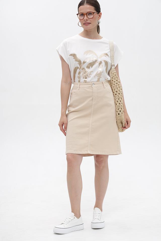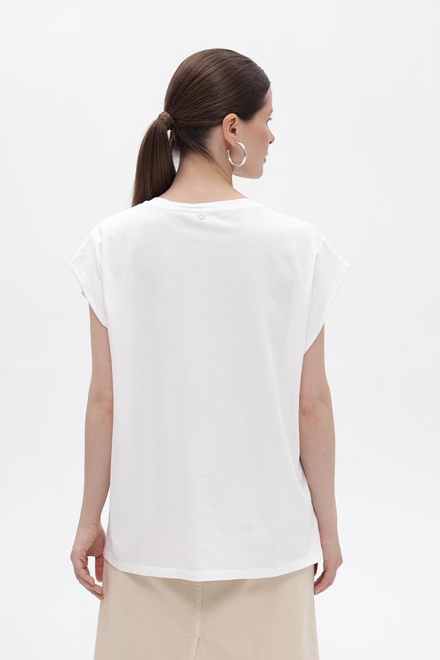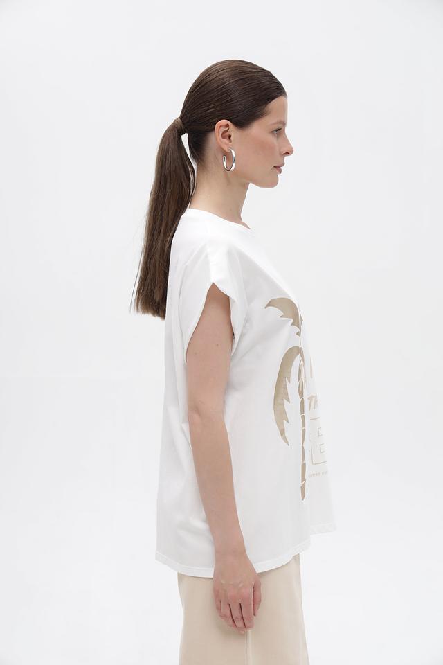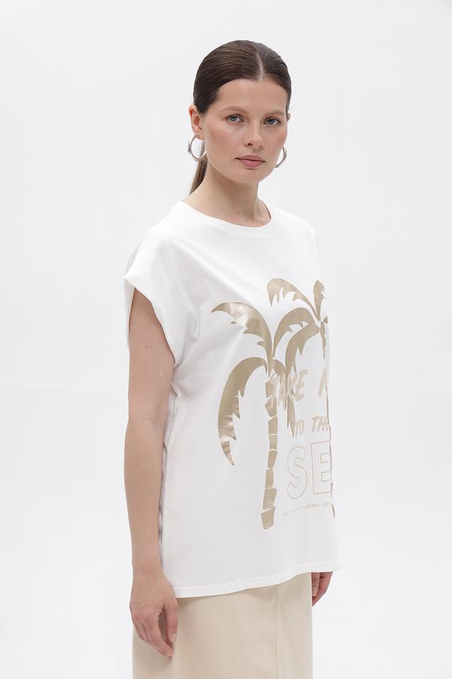 Футболка имеет свободный крой, который не сковывает движений и позволяет создать расслабленный образ. Короткие рукава-крылышки добавляют модели легкости и оригинальности. На передней части футболки расположен эффектный золотистый принт с изображением пальм, что придает ей летнее настроение.