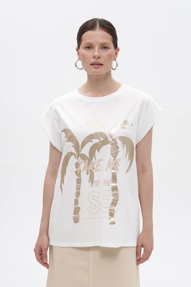 Белая футболка Marc Aurel с золотистым принтом в виде пальм. Модель из 100% хлопка отличается свободным кроем и короткими рукавами-крылышками, что обеспечивает комфорт в жаркую погоду. Состав: хлопок 100%