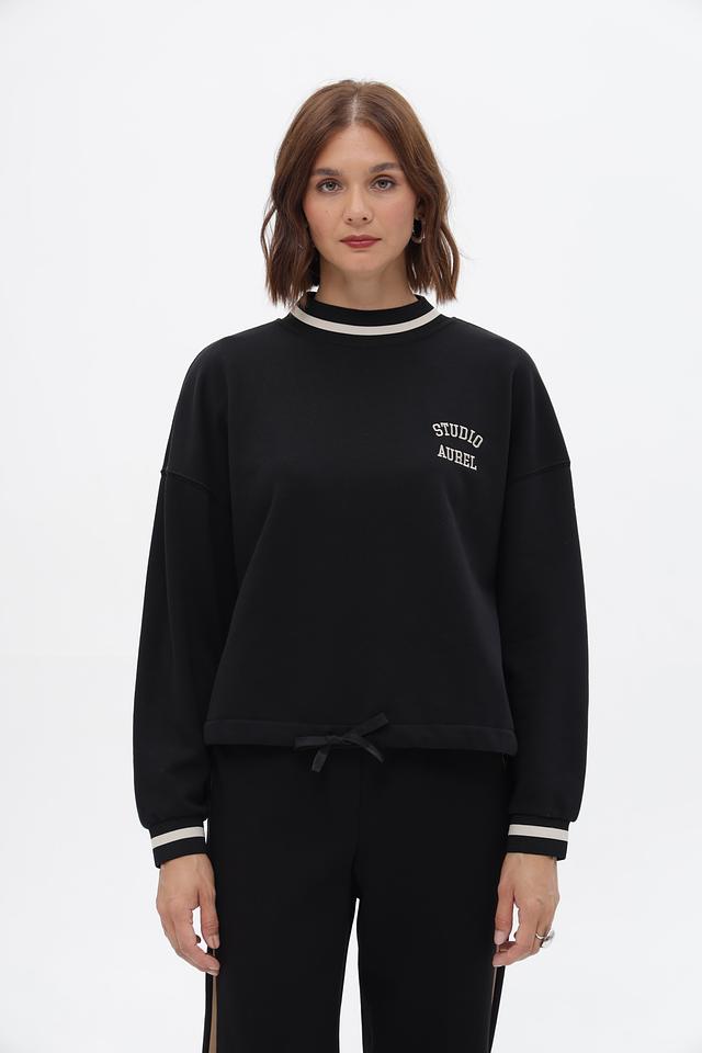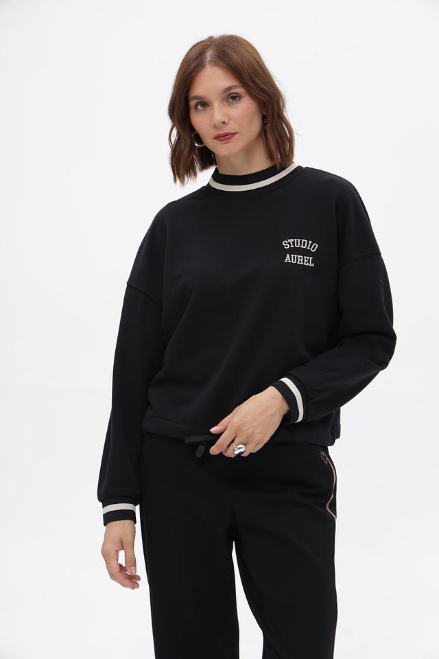 Дизайн пуловера лаконичен и минималистичен. На груди расположен белый логотип бренда 'STUDIO AUREL', выполненный в винтажном стиле. Контрастная белая полоса проходит по горловине и на рукавах, придавая модели спортивный вид.