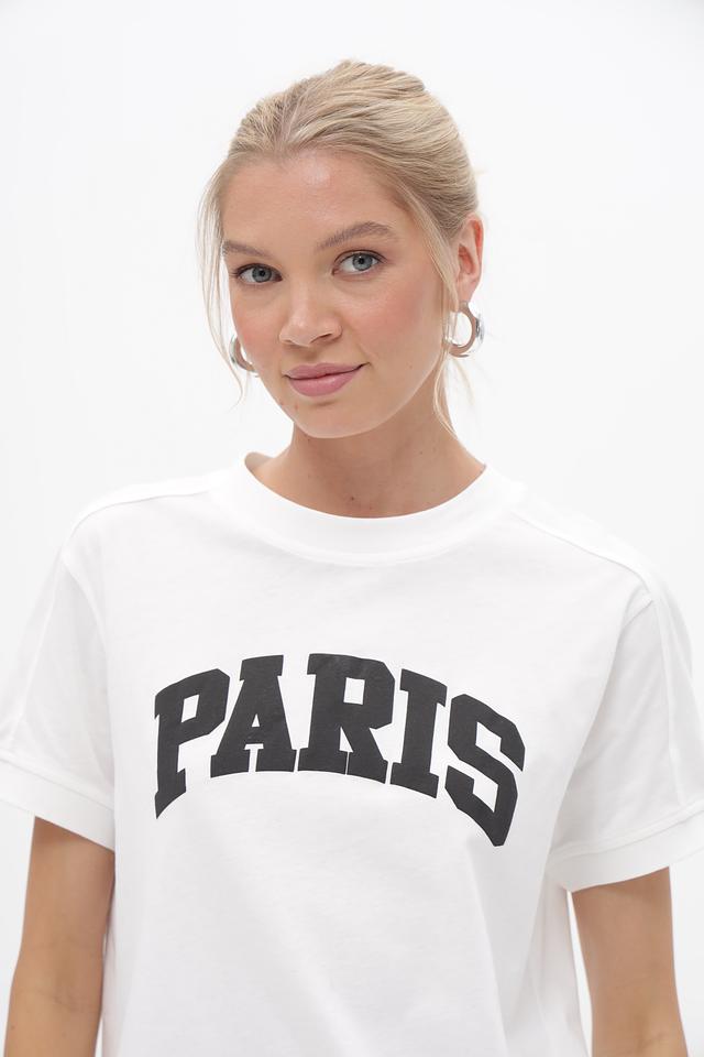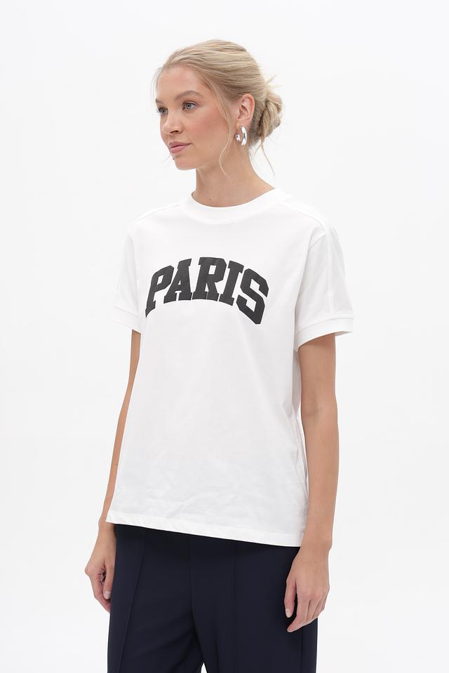 Футболка имеет прямой крой, который подходит для любого типа фигуры. На передней части футболки расположен чёрный принт с надписью "Paris", добавляющий образу стильный акцент.