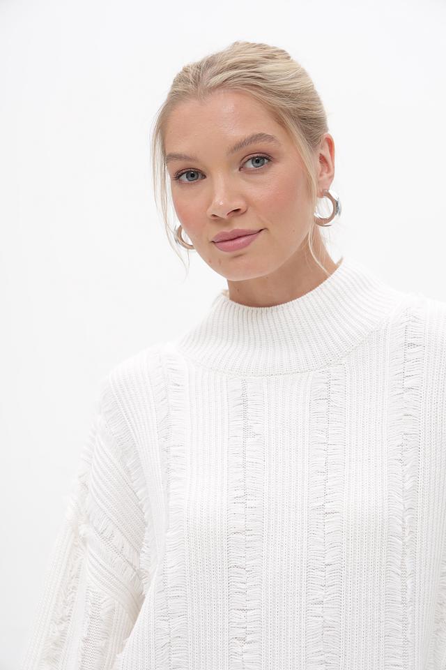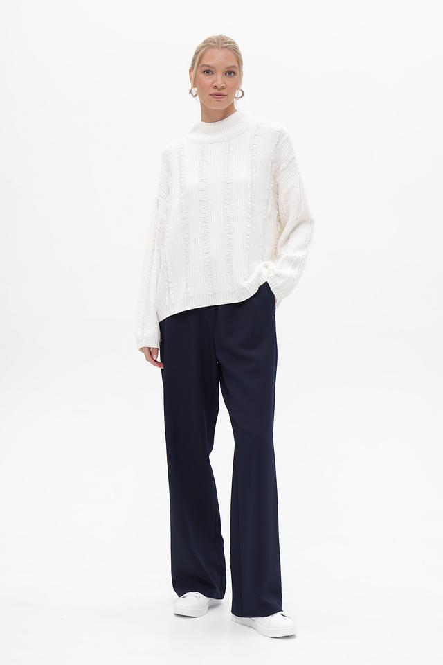 Пуловер имеет свободный крой, который обеспечивает комфорт и свободу движений. Выразительный узор из кос добавляет изделию текстуру и визуальный интерес. Высокий воротник-стойка делает модель более универсальной и позволяет сочетать ее с различными аксессуарами.