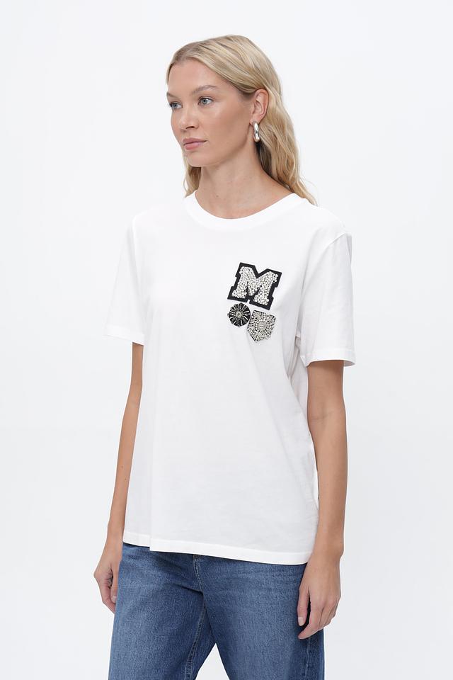 Особенность модели — стильная аппликация в виде буквы "M" и цветочного мотива, выполненная в черно-белой гамме. Этот декор добавляет футболке оригинальности и индивидуальности.