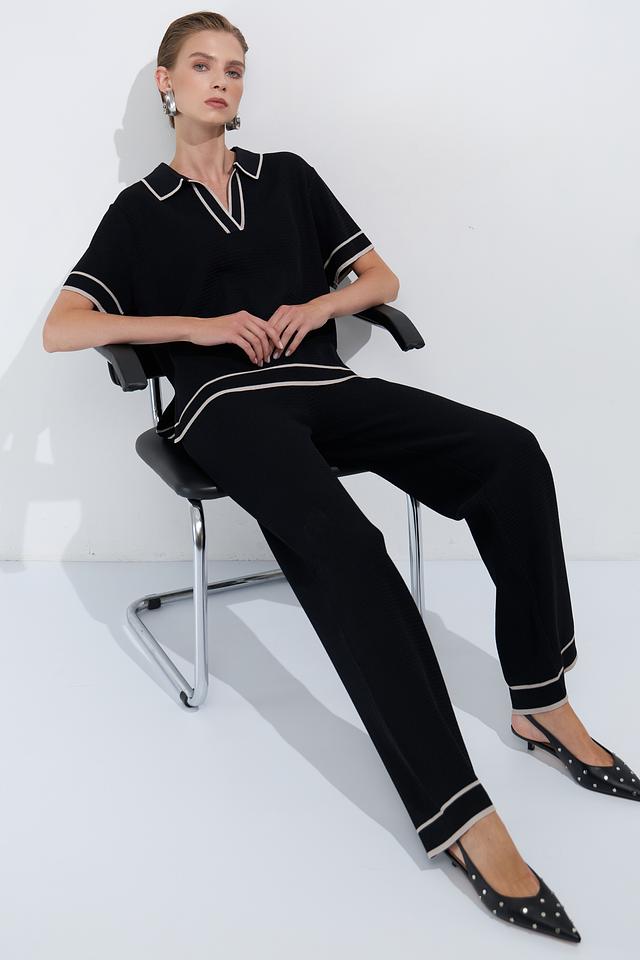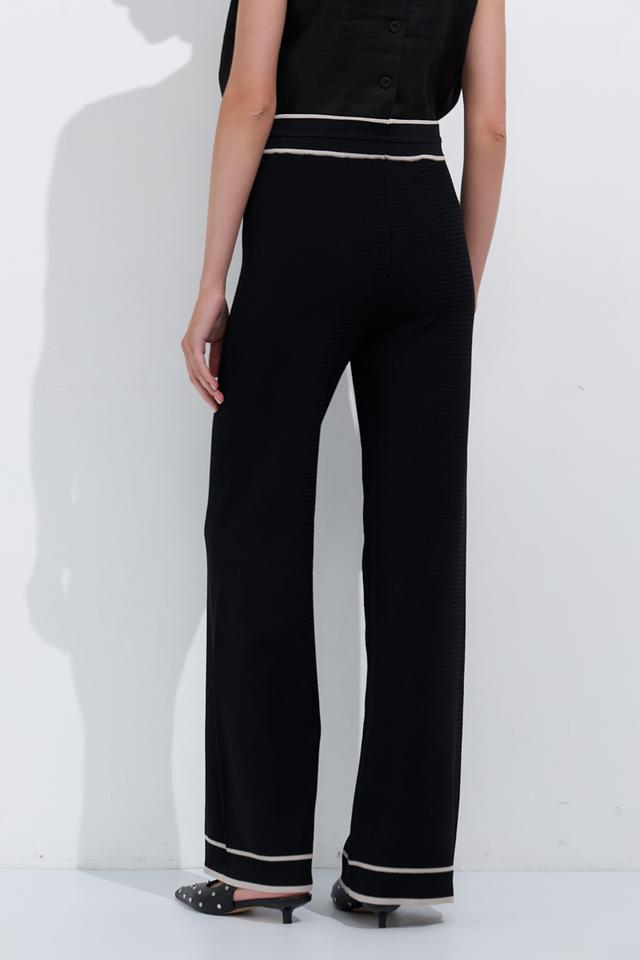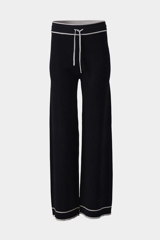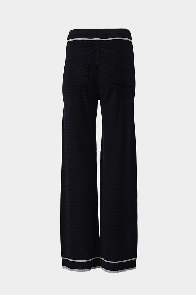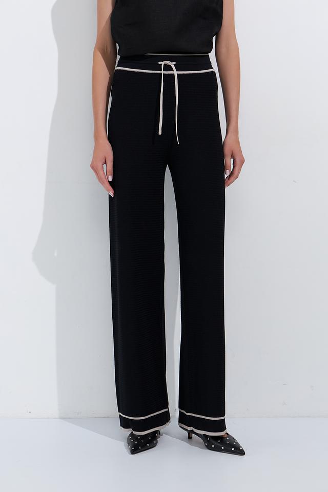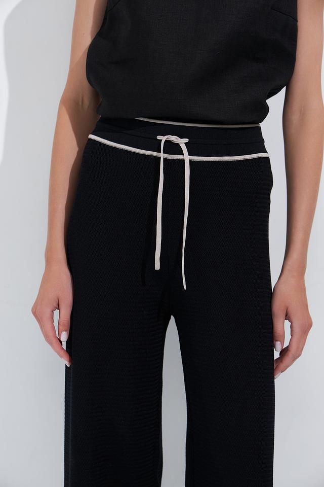 Особенностью модели является широкий крой палаццо, который визуально удлиняет ноги и создает элегантный силуэт. Контрастная белая отделка по краю брюк и на поясе добавляет акцент и делает модель более интересной. Удобный пояс с завязками обеспечивает идеальную посадку по фигуре.