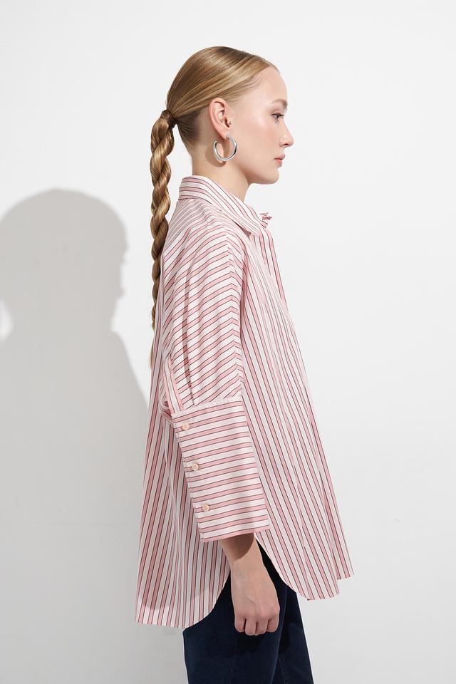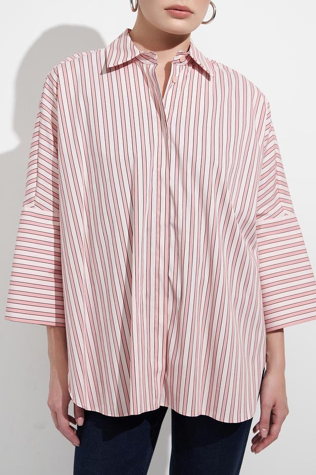 Блуза Marc Aurel нежно-розового цвета в полоску – стильное и комфортное решение для создания повседневных образов. Модель свободного кроя с рукавом 3/4 и классическим воротником. Состав: хлопок 78%, полиамид 19%, эластан 3%