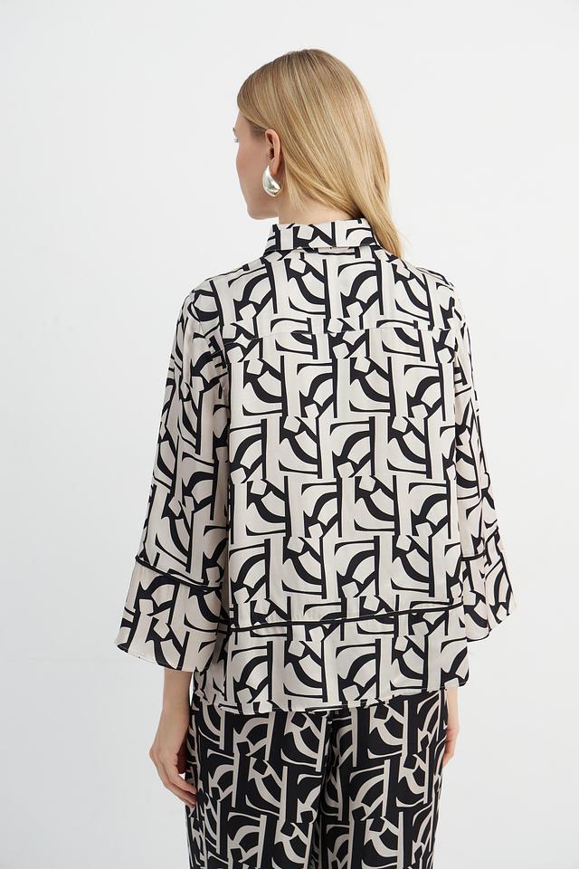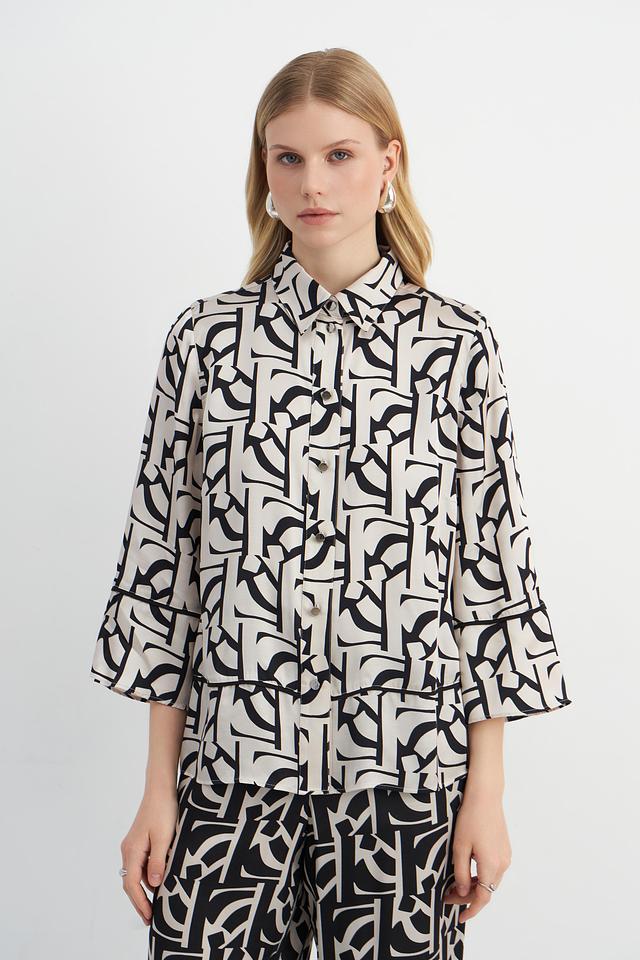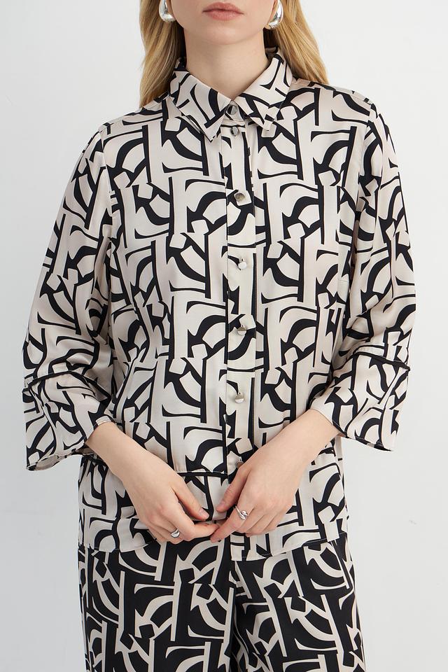 Блуза имеет классический крой с отложным воротником и застежкой на пуговицы. Рукава 3/4 делают ее универсальной для любого времени года. Свободный силуэт обеспечивает комфорт и свободу движений.