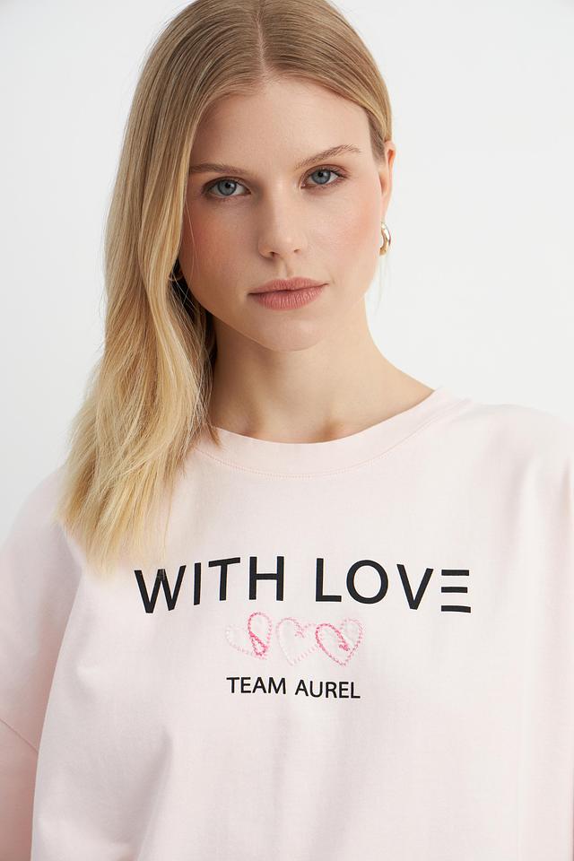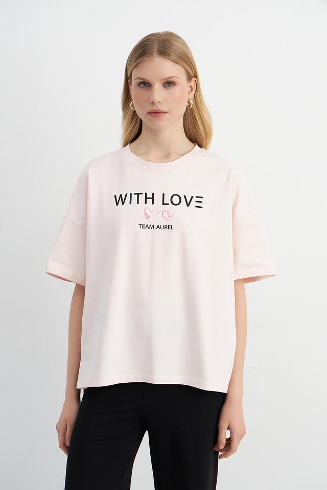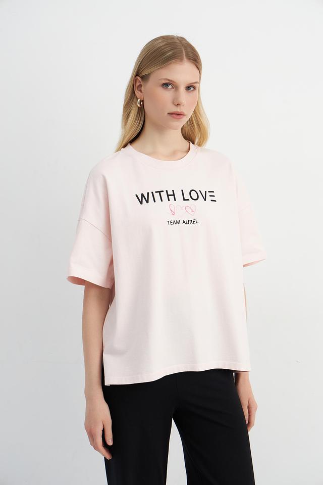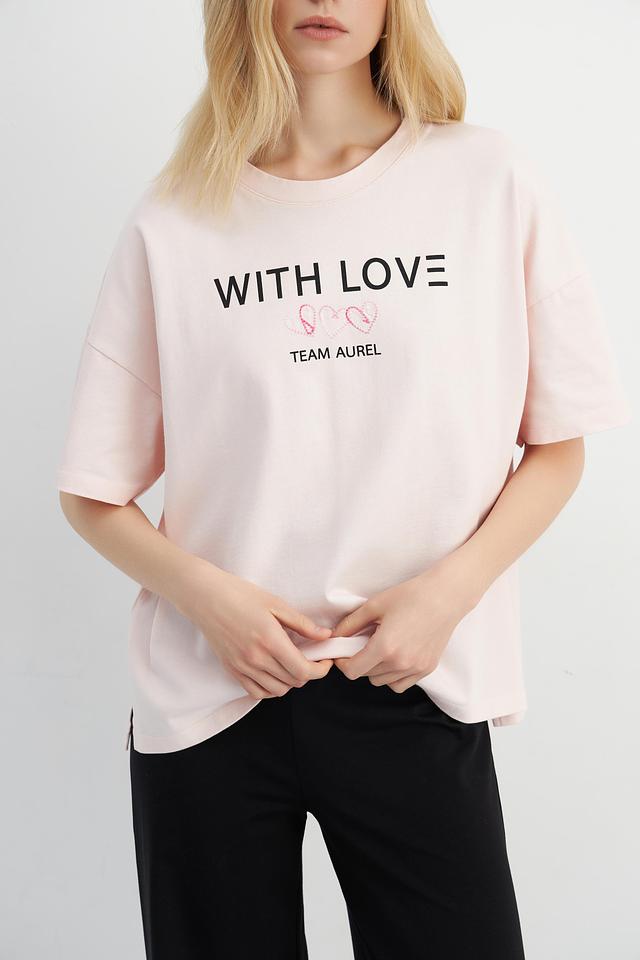 Женская футболка Marc Aurel нежно-розового цвета с надписью "WITH LOVE" и логотипом "TEAM AUREL". Модель оверсайз кроя выполнена из 100% хлопка, обеспечивая комфорт и воздухопроницаемость. Состав: хлопок 100%