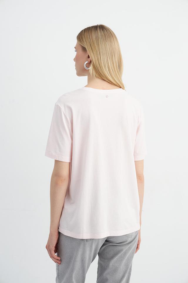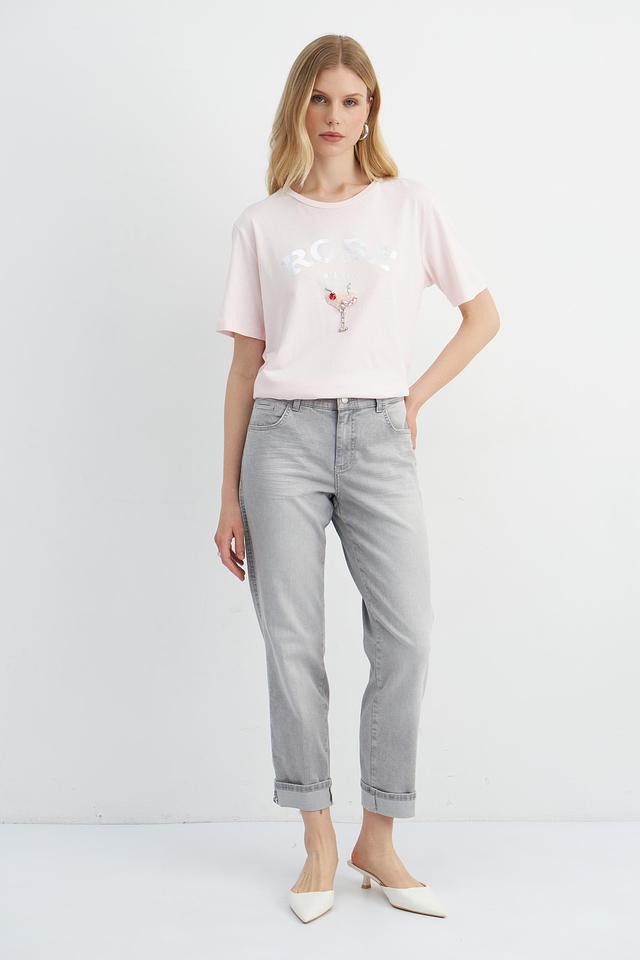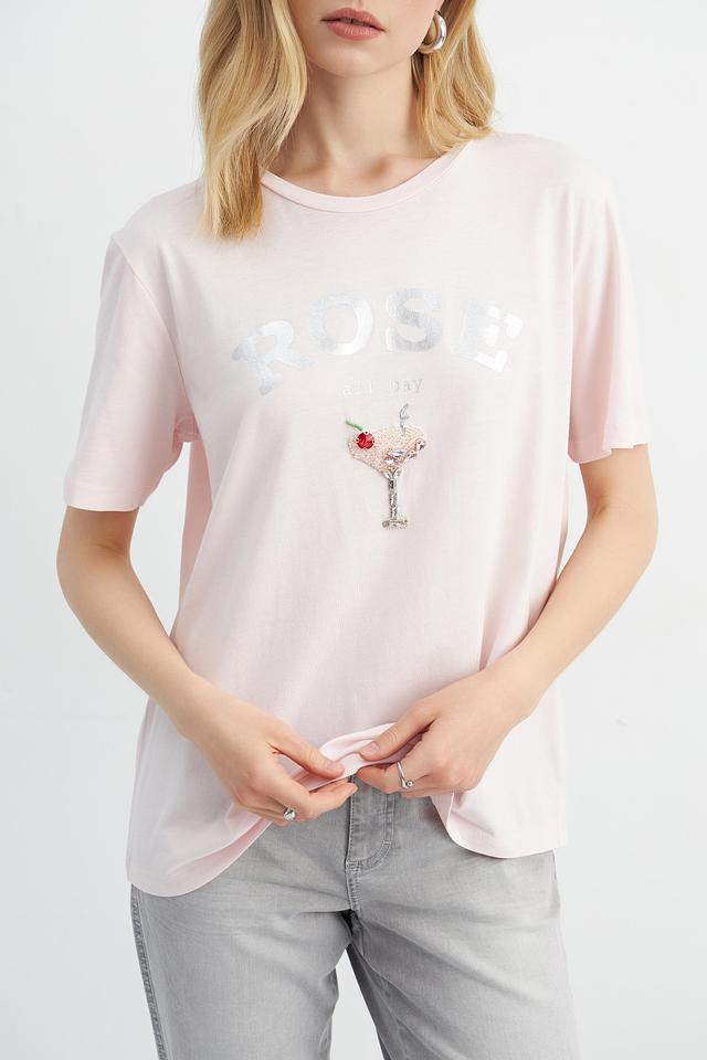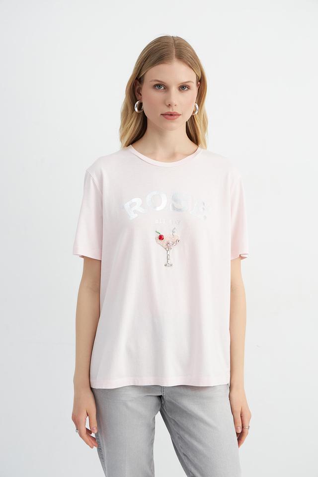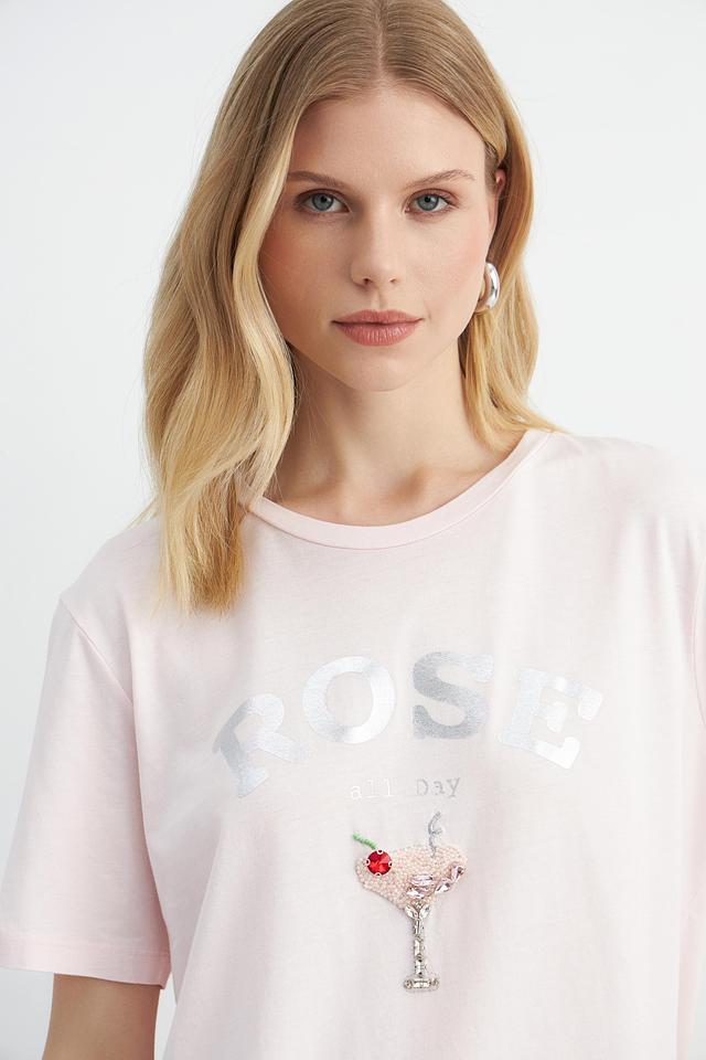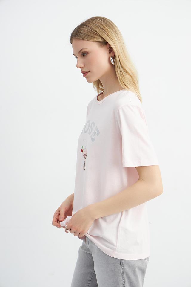 Футболка имеет прямой крой и короткие рукава. Основной цвет – нежно-розовый, который отлично сочетается с различными оттенками. Передняя часть футболки украшена ярким принтом с изображением розы и надписью "ROSE", выполненной в светло-голубом цвете.