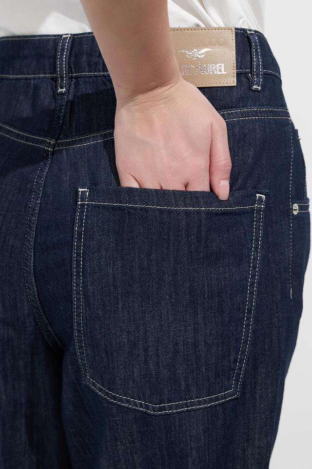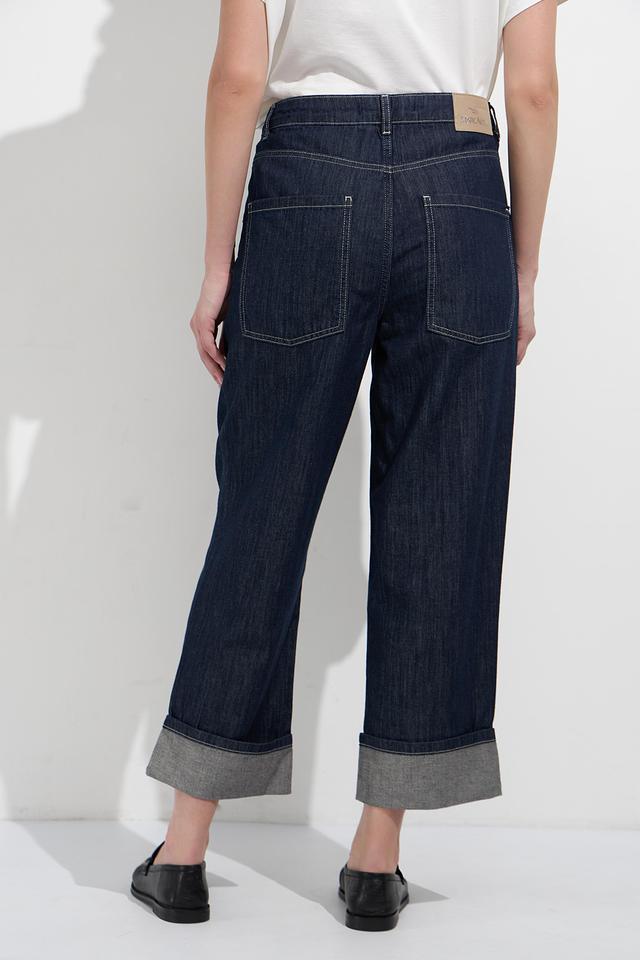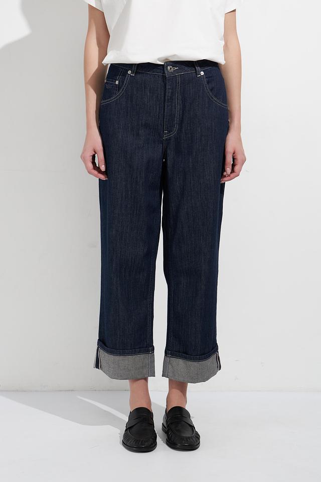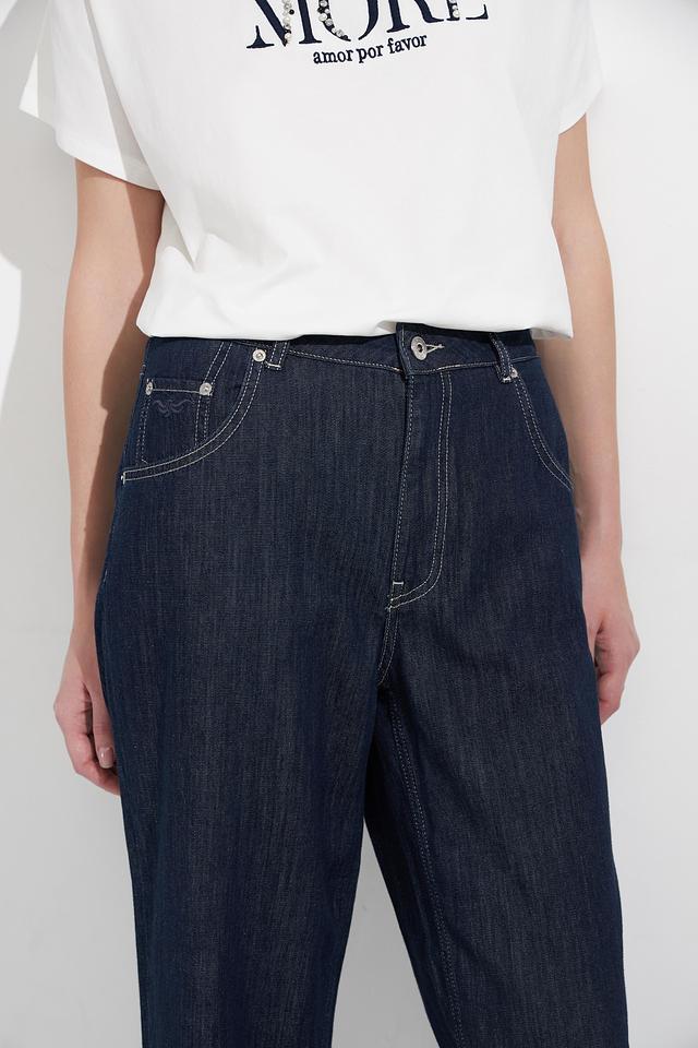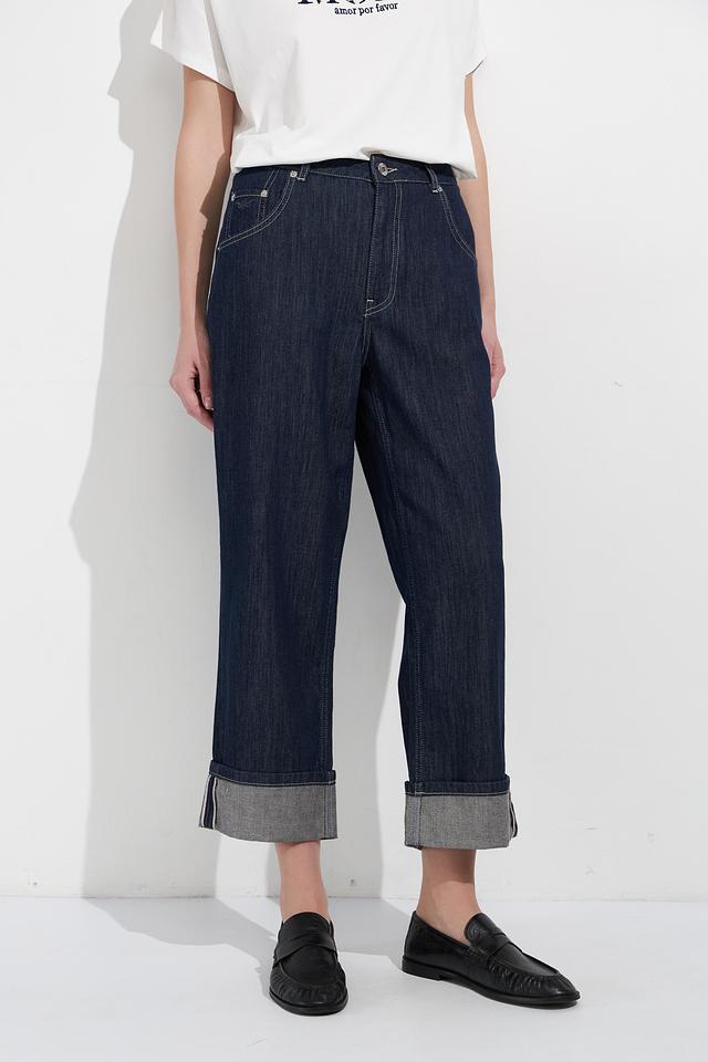 Джинсы имеют прямой крой и завышенную талию, что обеспечивает комфортную посадку по фигуре. Широкие штанины и необработанный низ с возможностью подворота добавляют образу непринужденности и современности.