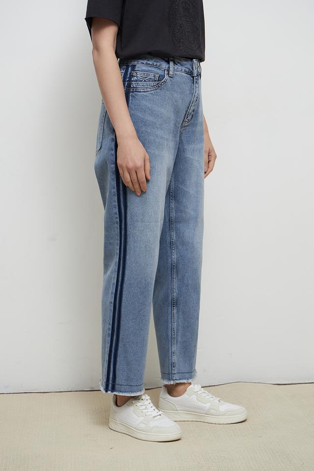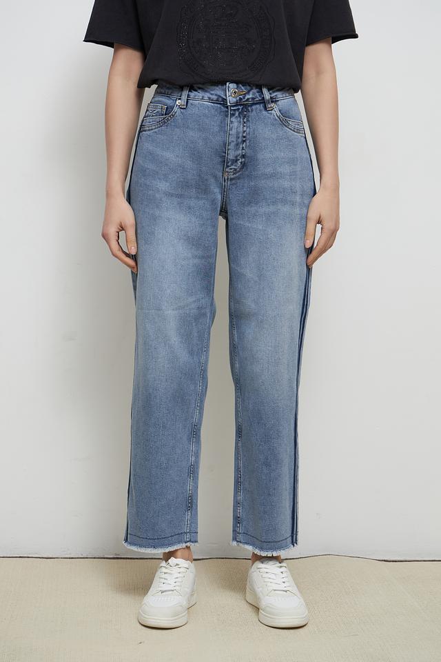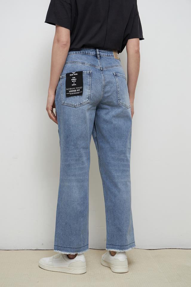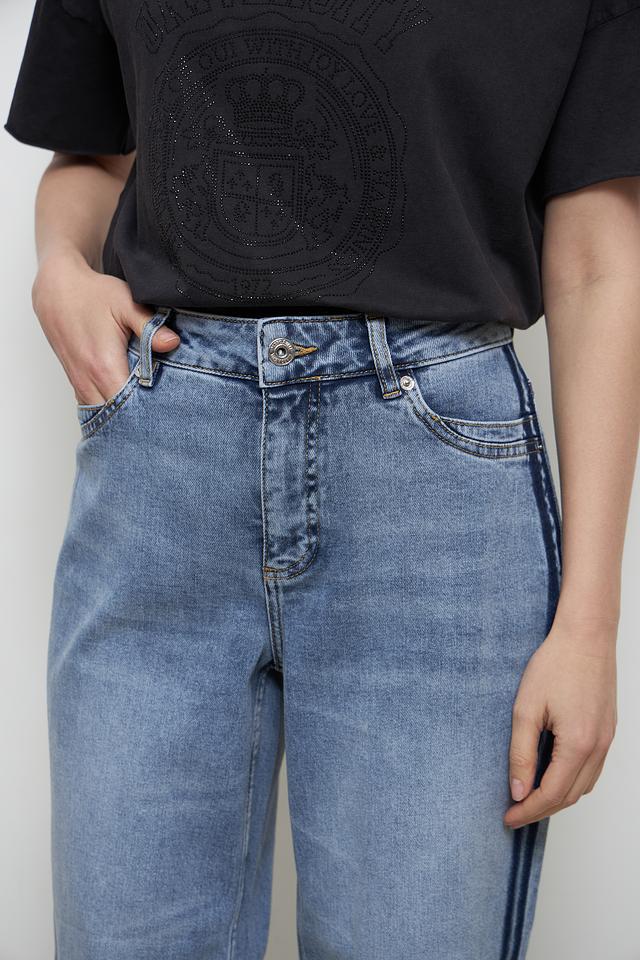 Джинсы имеют прямой крой и слегка завышенную талию, что обеспечивает комфортную посадку и подчеркивает достоинства фигуры. Особенности обработки ткани создают эффект лёгкого поношенности, придавая джинсам непринужденный вид.