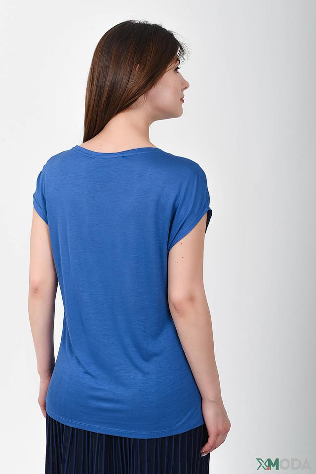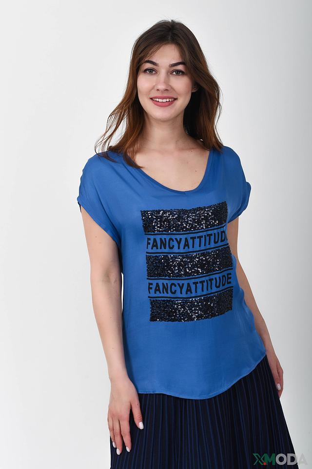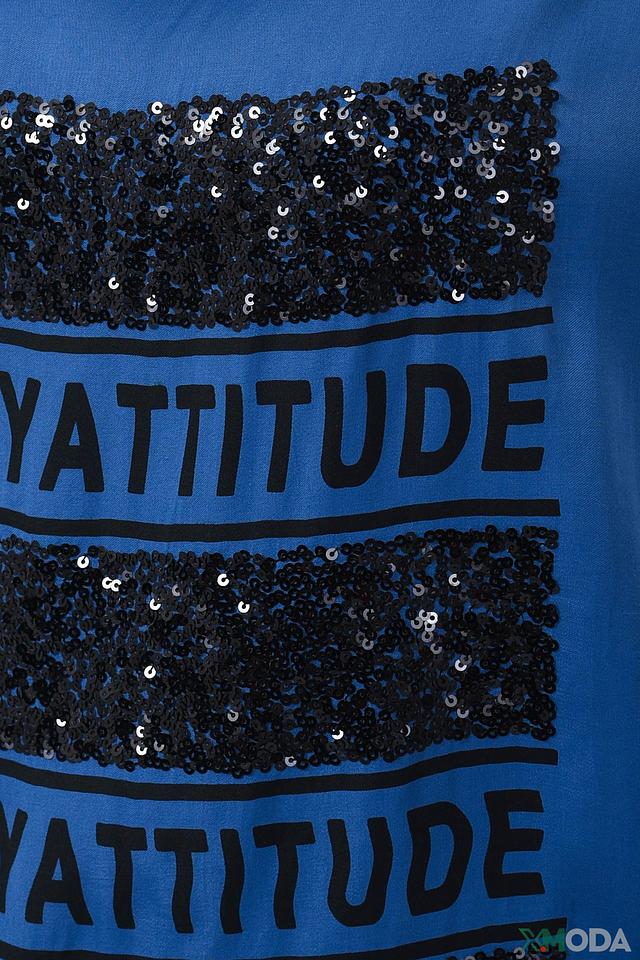 Основной цвет футболки – насыщенный синий. Модель украшена яркими черными пайетками, расположенными в виде полос и надписи "FANCY ATTITUDE". Этот декор придает изделию оригинальность и привлекает внимание.