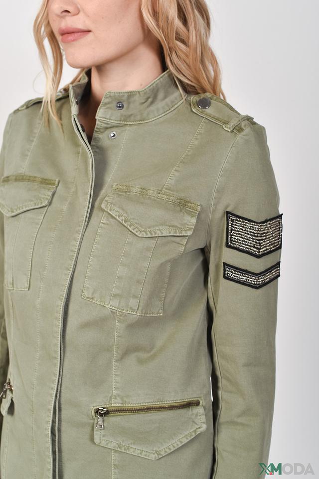 Жакет имеет воротник-стойку, застегивается на молнию и кнопки. На плечах расположены декоративные погоны, а спереди – два накладных кармана с клапанами. Рукава жакета имеют манжеты с пуговицами.
