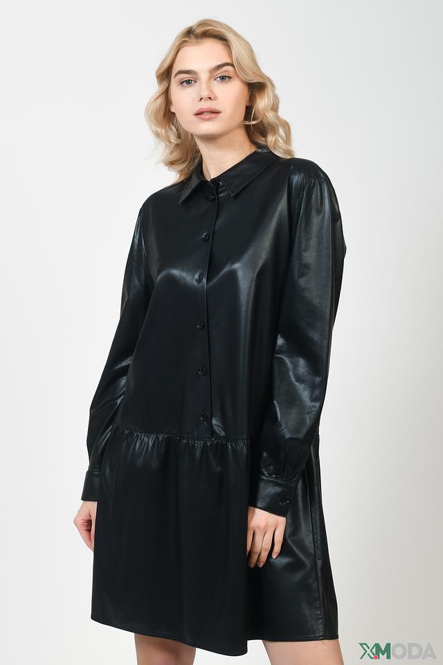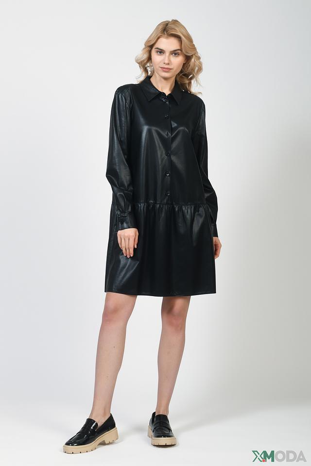 Чёрное платье Marc Aurel из экокожи – стильная и современная модель с рубашечным кроем и рукавами-фонариками. Платье застегивается на пуговицы и имеет сборку по линии талии, создающую женственный силуэт. Состав: хлопок 100%