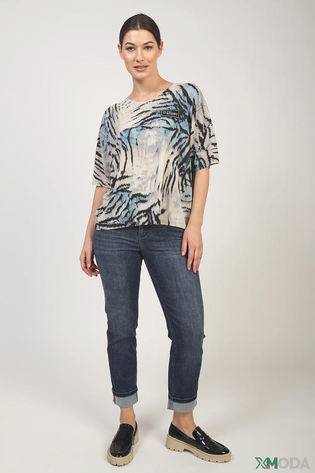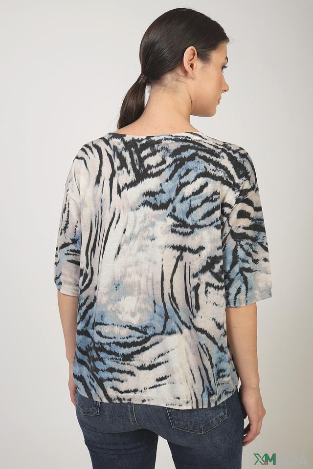 Пуловер имеет свободный крой, который обеспечивает свободу движений, а короткие рукава делают его идеальным для теплой погоды. Особенностью модели является эффектный тигровый принт, выполненный в светло-серых и голубых тонах.