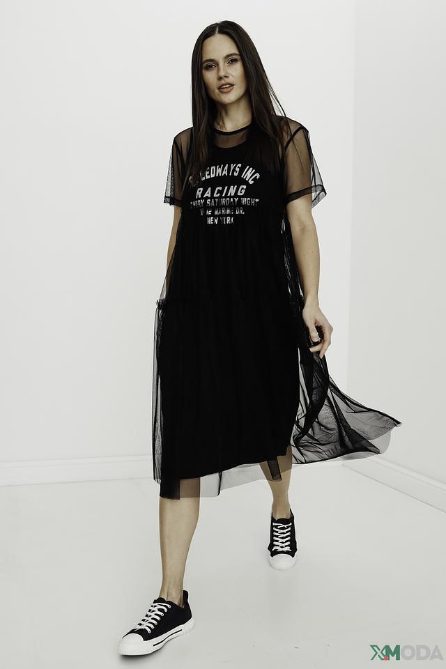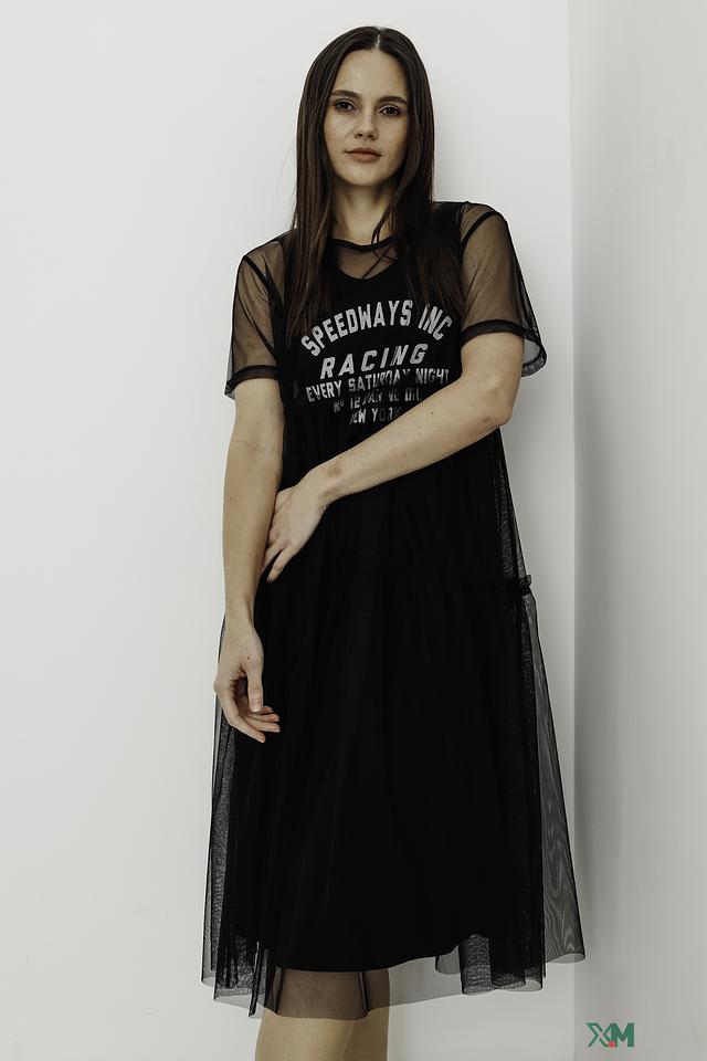 Особенностью этого платья является его многослойный дизайн. Верхняя часть платья выполнена из полупрозрачной сетки, а нижняя – из плотной ткани, что создает интересный эффект. На платье нанесен яркий принт с надписью, добавляющий образу индивидуальности.