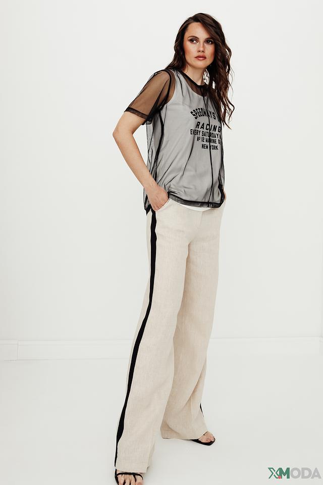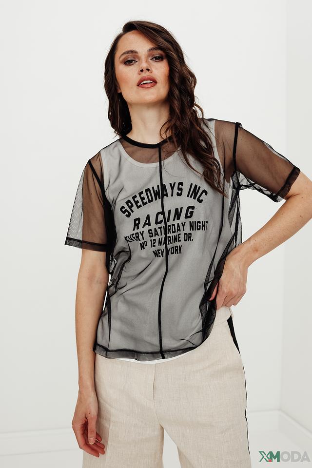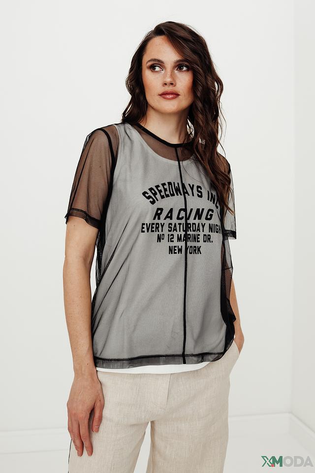 Особенностью данной модели является полупрозрачная сетка, которая создает эффект легкости и воздушности. На блузе нанесен яркий принт "Speedways Racing", выполненный в черном цвете, который добавляет образу динамичности и индивидуальности. Черная отделка по горловине и рукавам подчеркивает современный дизайн.