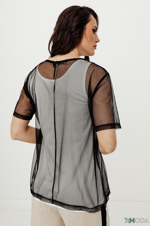 Стильная блуза Marc Aurel серого цвета с оригинальным принтом "Speedways Racing". Изделие выполнено из полупрозрачной сетки с черной отделкой, что придает ему легкость и современный вид. Идеально подойдет для создания яркого и запоминающегося образа. Состав: полиэстер 50%, хлопок 50%
