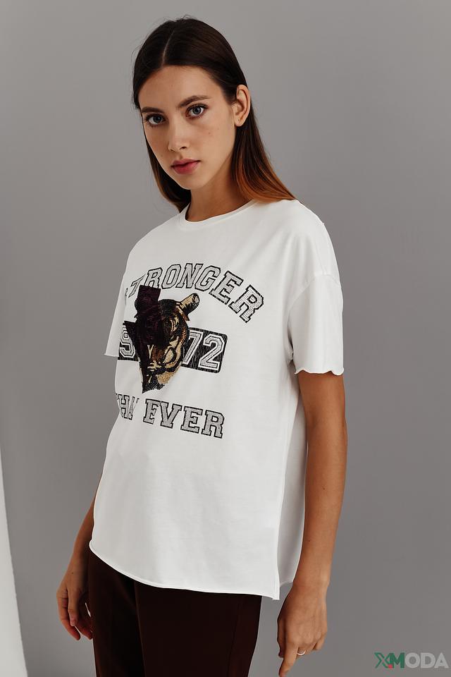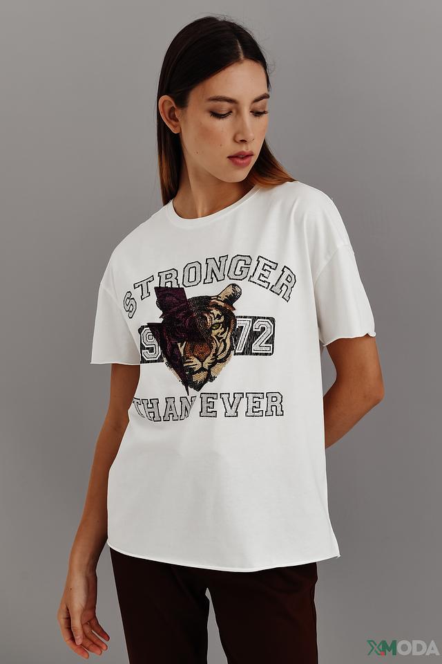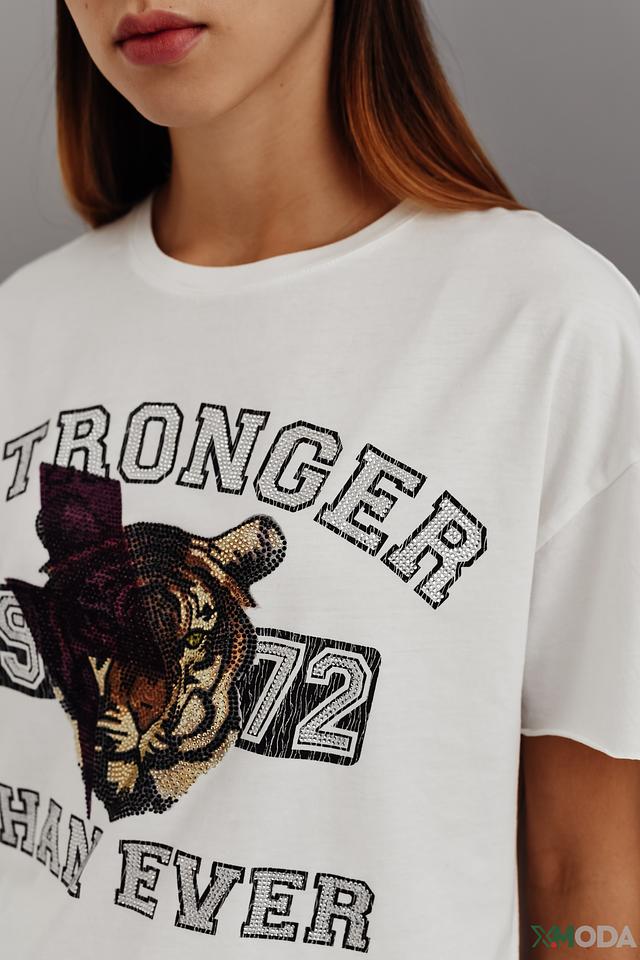 Основным акцентом футболки является яркий принт с изображением медведя и надписью "STRONGER THAN EVER". Этот принт добавляет образу оригинальности и индивидуальности.