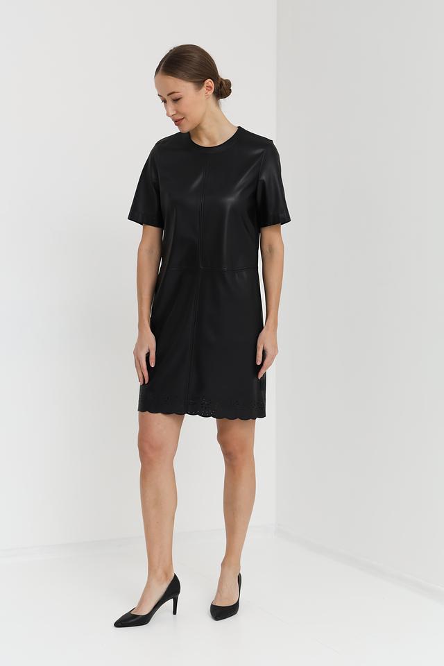 Чёрное платье от Marc Cain выполнено из гладкой экокожи. Модель имеет прямой силуэт, короткие рукава и декоративную перфорацию по низу. Идеальный выбор для создания стильного и современного образа. Состав: полиэстер 100%