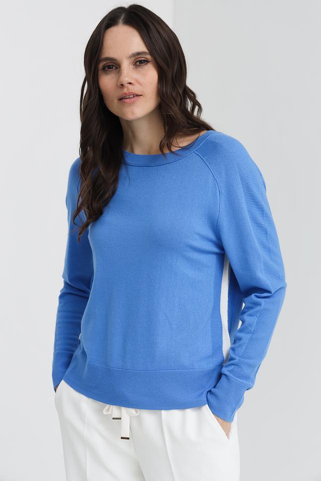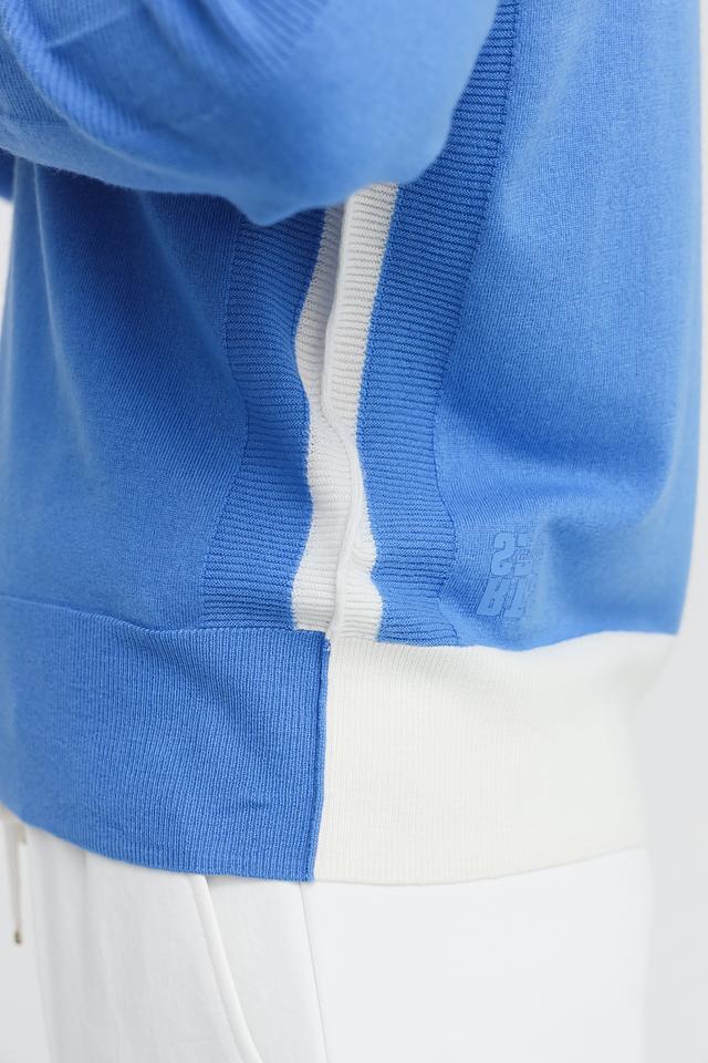 Особенностью данного пуловера являются контрастные белые полоски на рукавах, которые придают ему спортивный и современный вид. Пуловер выполнен из смеси высококачественных материалов: 47% шерсти, 38% вискозы, 10% полиамида и 5% кашемира.