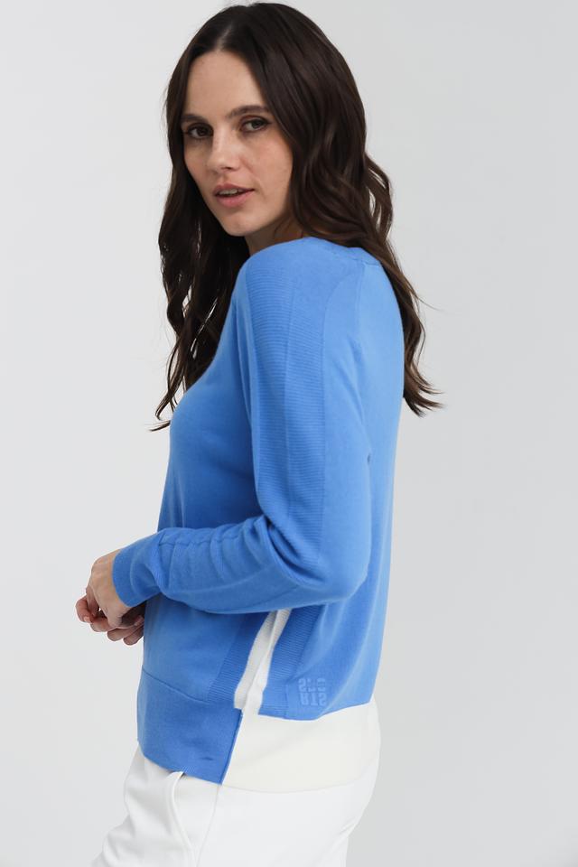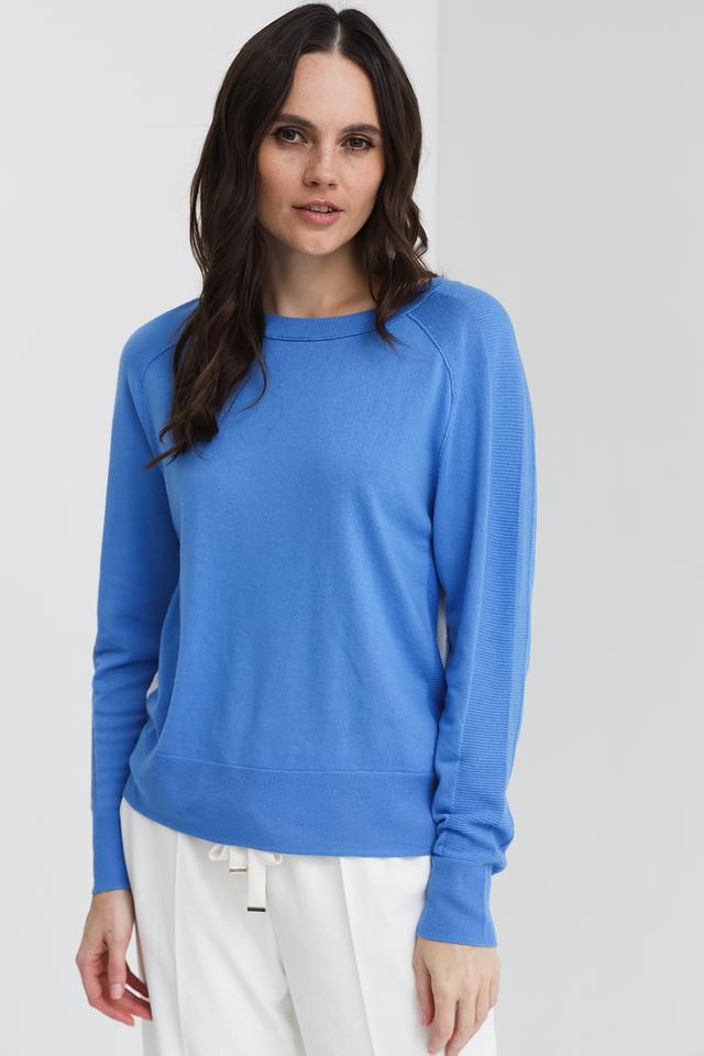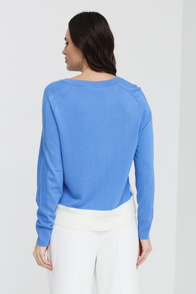 Голубой пуловер Marc Cain – это стильная и комфортная модель с круглым вырезом и полосками на рукавах. Изготовлен из высококачественной шерсти, вискозы, полиамида и кашемира, обеспечивающих мягкость и тепло. Состав: шерсть 47%, вискоза 38%, полиамид 10%, кашемир 5%