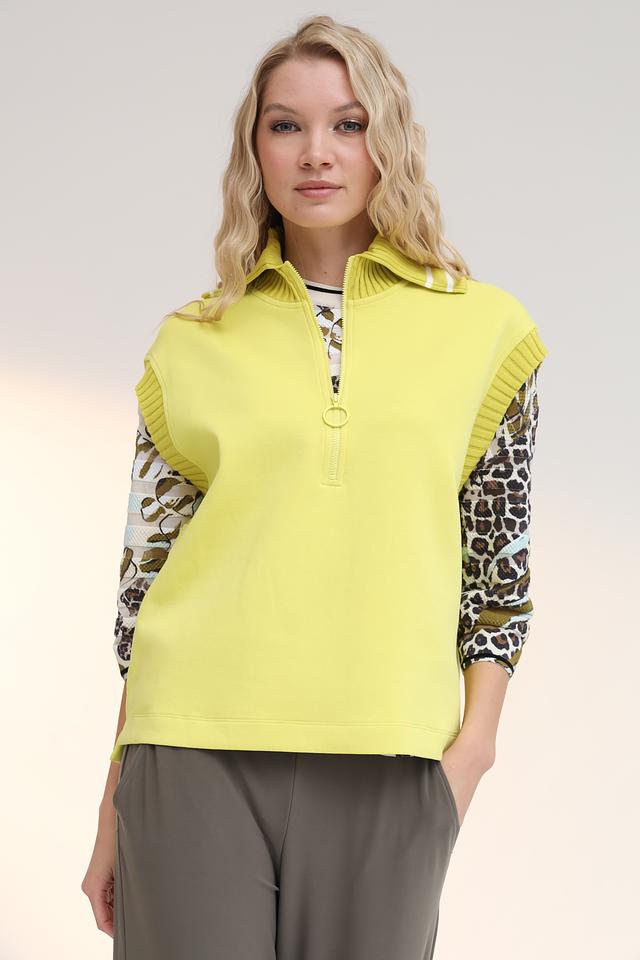 Женский жилет Marc Cain цвета лайм с оригинальным дизайном. Модель выполнена из мягкого хлопка с добавлением полиэстера и эластана, имеет застежку-молнию и вставки с леопардовым принтом. Состав: хлопок 88%, полиэстер 8%, эластан 4%