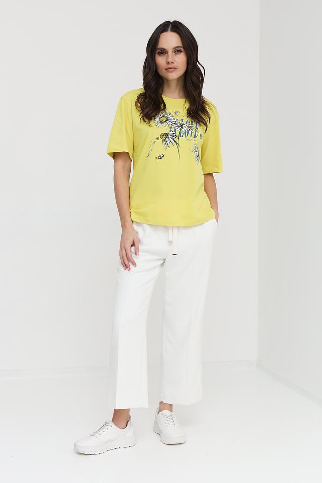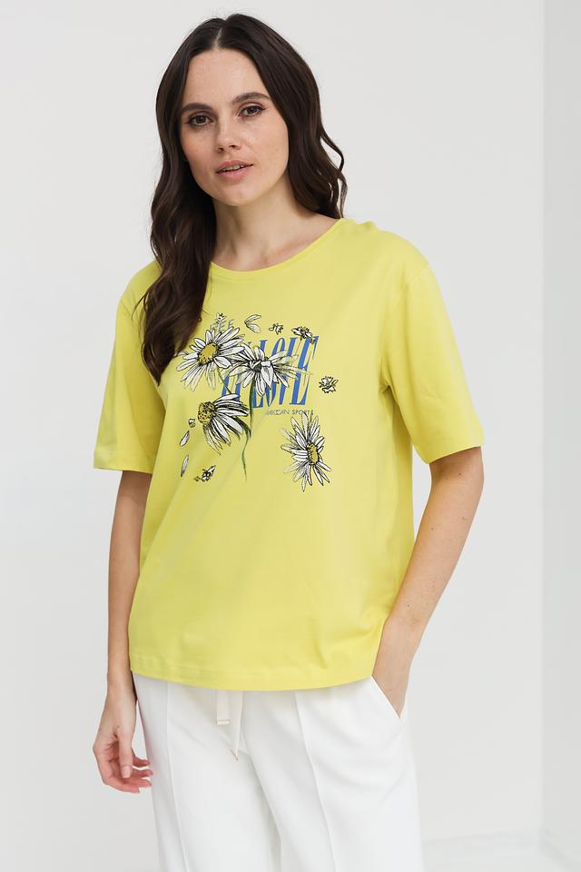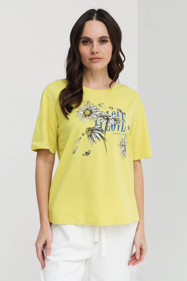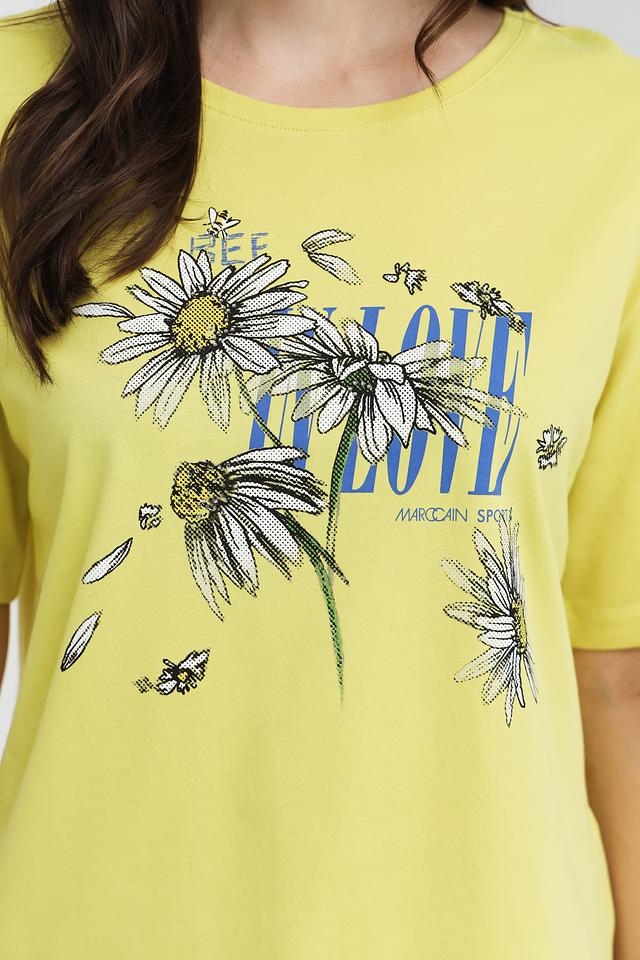 Жёлтая футболка Marc Cain Sports с цветочным принтом и надписью. Модель выполнена из 100% хлопка, обеспечивая комфорт и воздухопроницаемость. Стильный и удобный вариант для повседневного образа. Состав: хлопок 100%