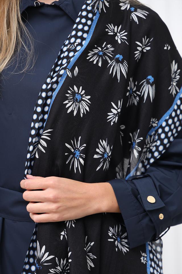 Элегантный платок Marc Cain чёрного цвета с ярким цветочным принтом и голубой отделкой станет стильным дополнением к вашему образу. Изготовлен из высококачественного хлопка и шёлка, обеспечивая комфорт и роскошный вид. Состав: хлопок 70%, шелк 30%