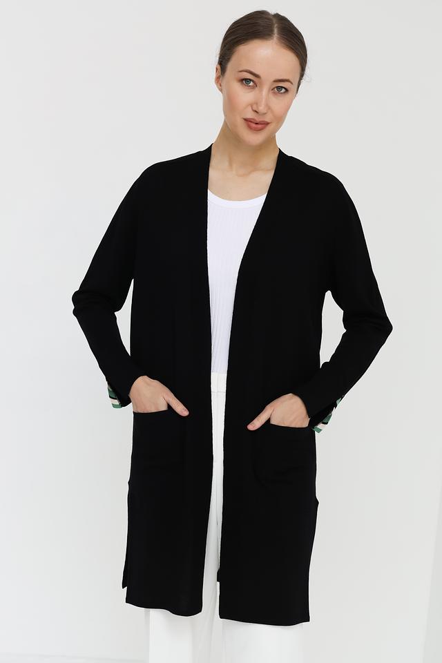 Модель имеет прямой крой, длинный силуэт и открытый фасад без застежек, что позволяет носить его поверх различных нарядов.