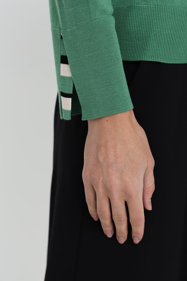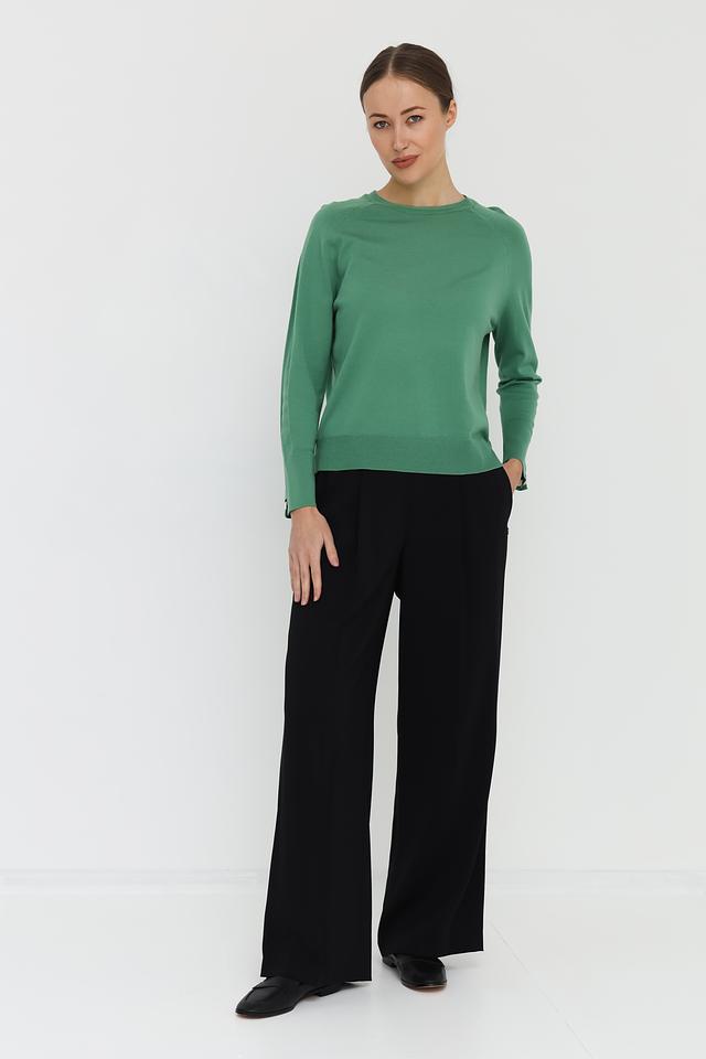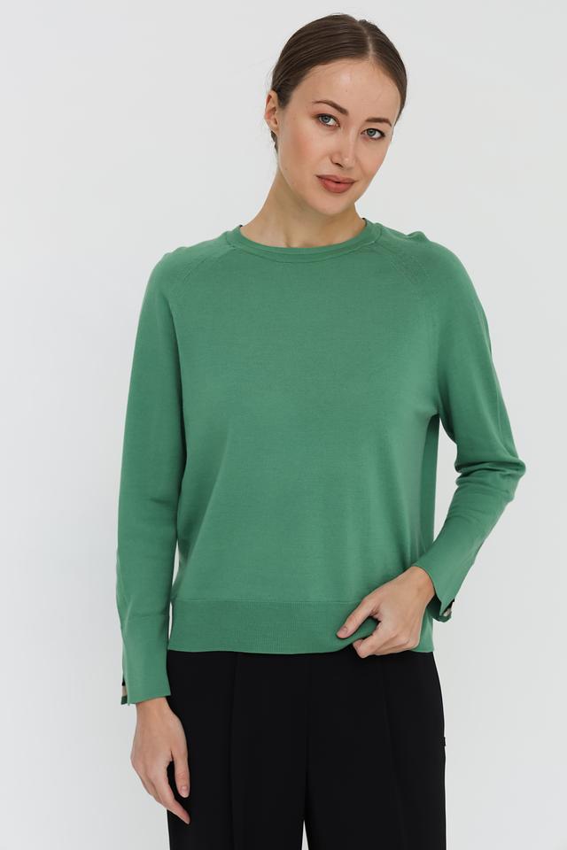 Модель имеет классический прямой крой и круглый вырез горловины. Пуловер выполнен в спокойном зелёном цвете, который легко сочетается с различными элементами гардероба.