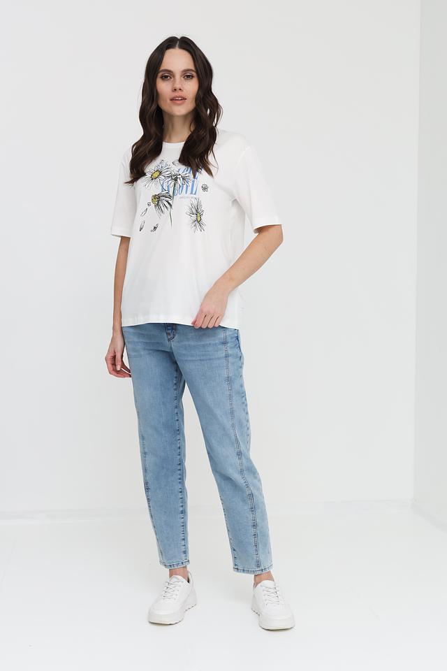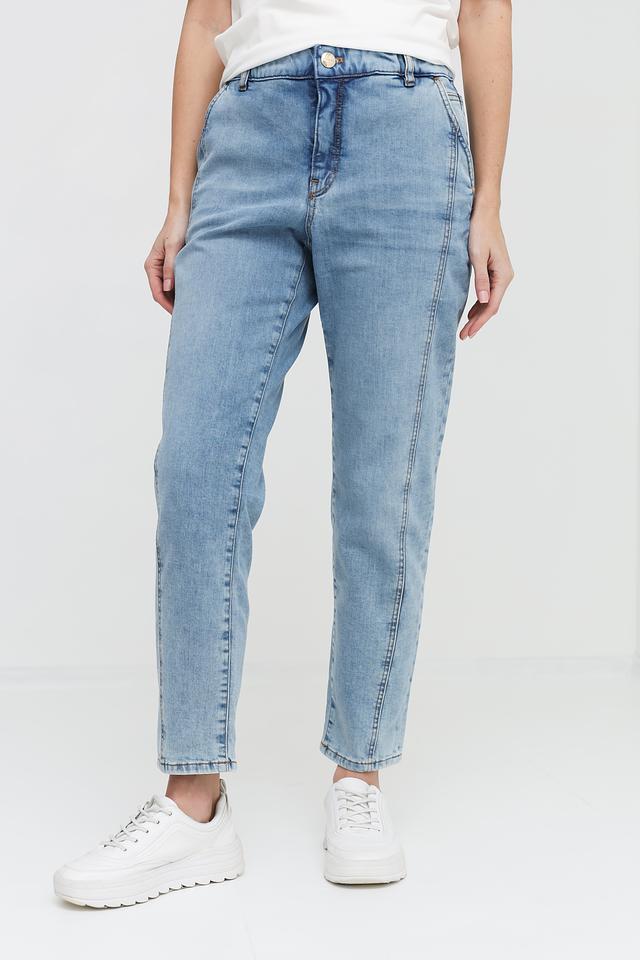 Джинсы имеют высокую посадку, прямой крой и классическую застежку на пуговицу. Отличительной особенностью являются вертикальные декоративные строчки, которые визуально вытягивают силуэт и придают джинсам оригинальный вид. Задние карманы классической формы.