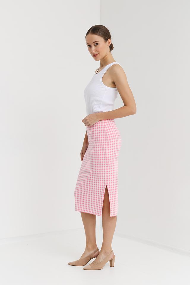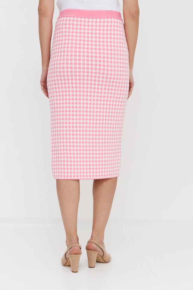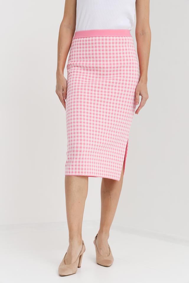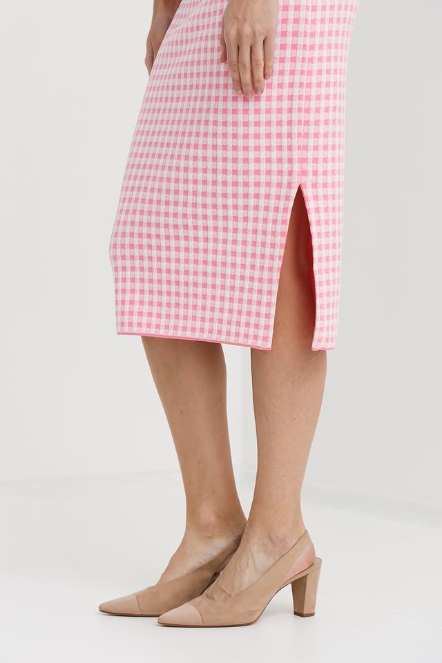 Юбка Marc Cain Collections выполнена в нежно-розовую клетку. Модель миди с разрезом и эластичным поясом станет отличным дополнением к вашему гардеробу. Состав: Состав_подкладка полиэстер 100%, хлопок 55%, вискоза 43%, эластан 2%