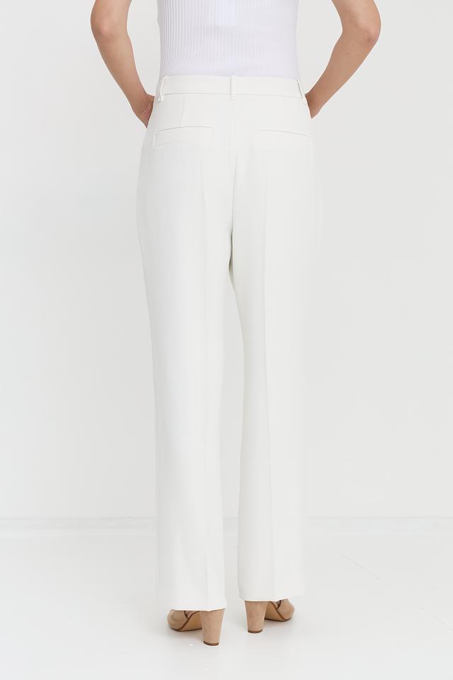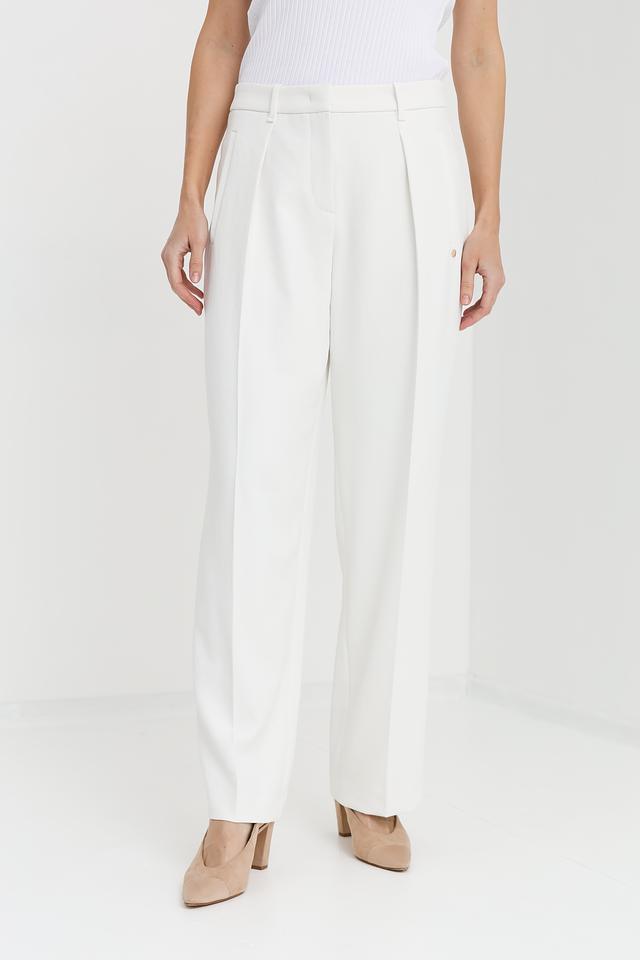 Брюки имеют прямую посадку и широкие штанины, что обеспечивает свободу движений и комфорт в течение всего дня. Высокая посадка визуально удлиняет ноги и подчеркивает талию. Модель дополнена аккуратными складками спереди, придающими ей более изысканный вид.