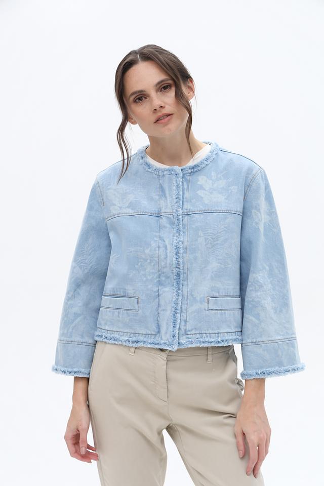 Жакет Marc Cain светло-голубого цвета выполнен из денима с эффектом потертости и декорирован бахромой. Модель застегивается на молнию и имеет короткие рукава, что придает ей легкий и непринужденный вид. Состав: хлопок органич. 99%, эластан 1%