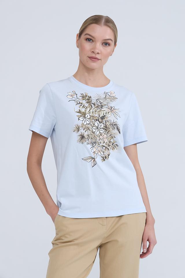 Женская футболка Marc Cain светло-голубого цвета украшена ярким цветочным принтом. Изготовлена из 100% хлопка, обеспечивая комфорт и воздухопроницаемость. Стильный и удобный вариант для повседневного образа. Состав: хлопок 100%