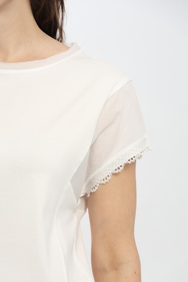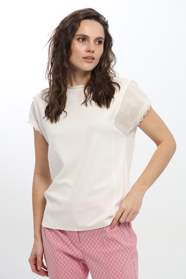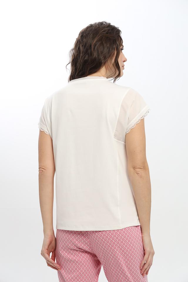 Футболка имеет классический белый цвет, который легко сочетается с любой одеждой. Короткий рукав и круглый вырез горловины делают ее идеальной для повседневной носки. Особый шарм модели придают изящные воланы по краю рукавов и низу изделия.