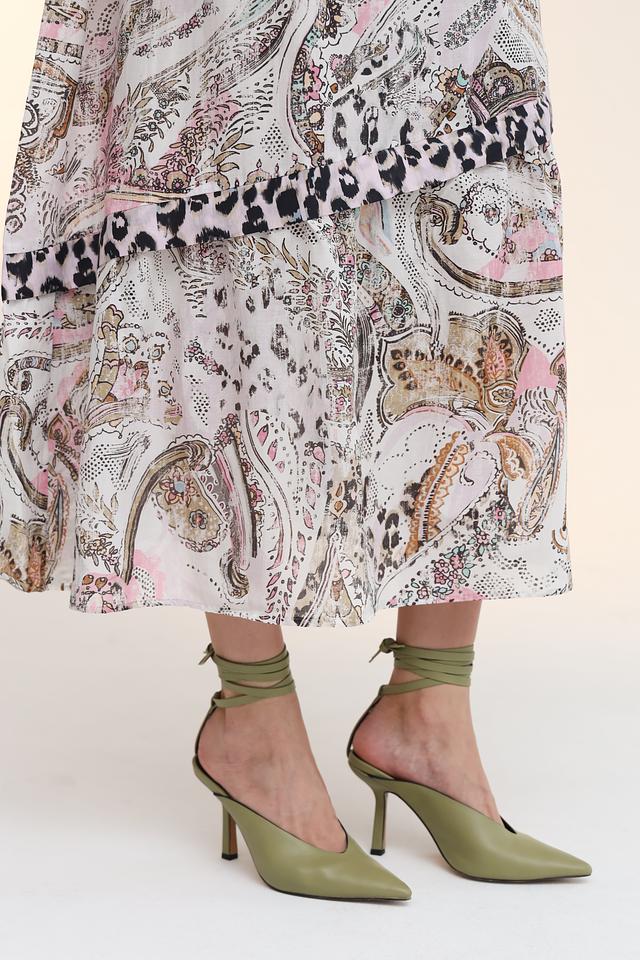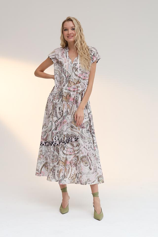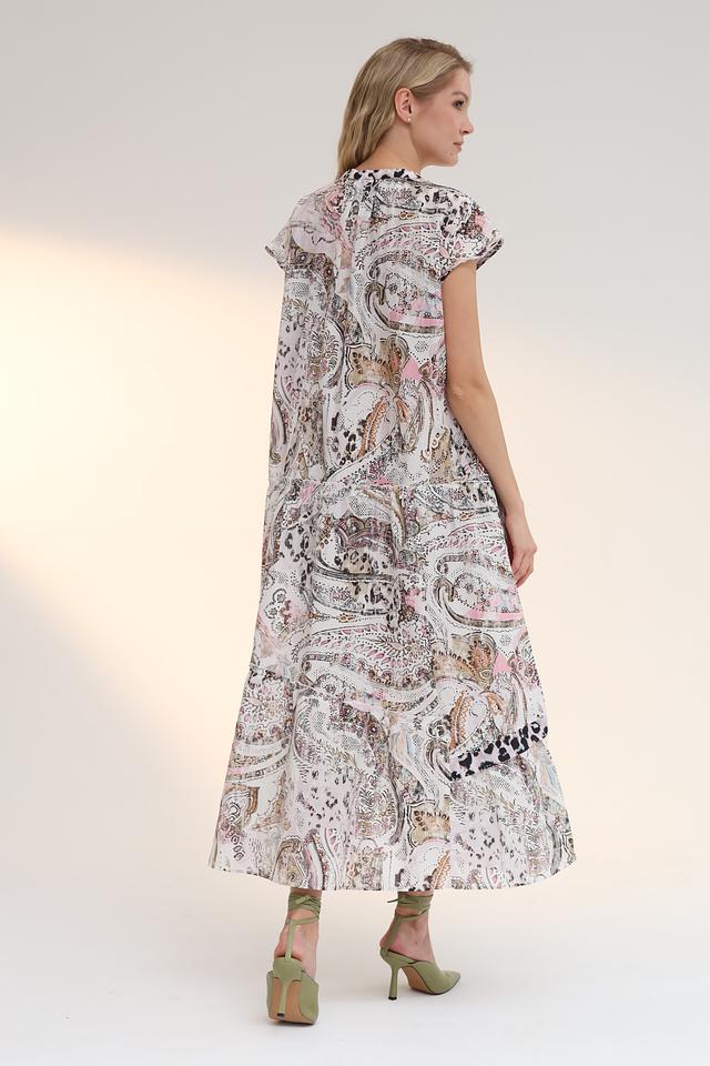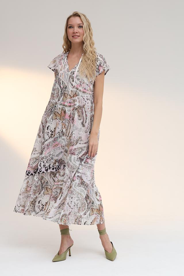 Модель имеет свободный крой, который обеспечивает комфорт и свободу движений. V-образный вырез горловины и короткие рукава придают платью лёгкость и воздушность. Платье выполнено из высококачественного хлопка с добавлением шелка, что делает его приятным на ощупь и обеспечивает отличную посадку.
