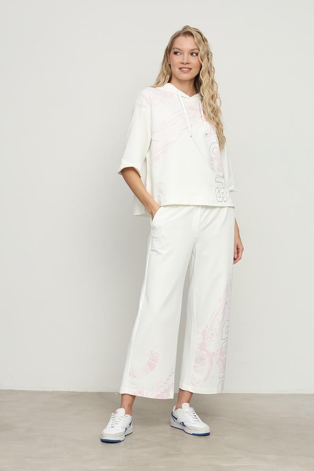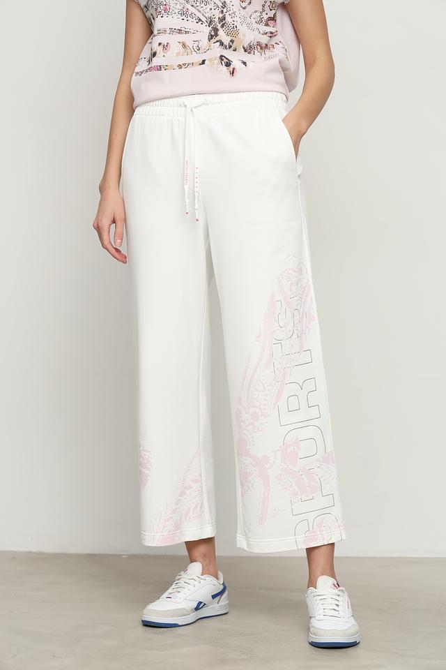 Белые спортивные брюки от Marc Cain Sports с оригинальным принтом. Модель выполнена из мягкой ткани с добавлением эластана для комфортной посадки и свободы движений. Идеальный выбор для активного образа жизни. Состав: полиамид 64%, хлопок 33%, эластан 3%