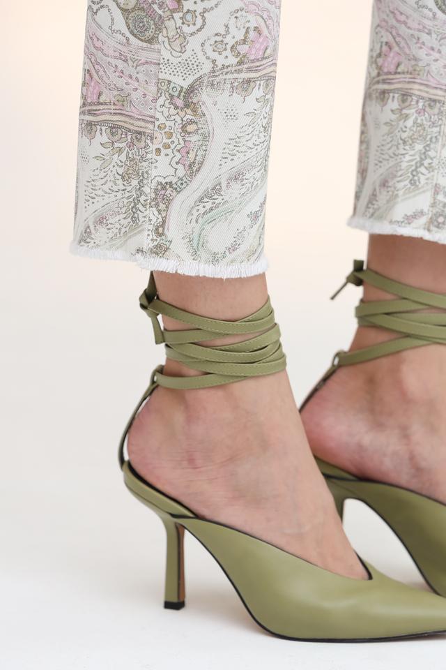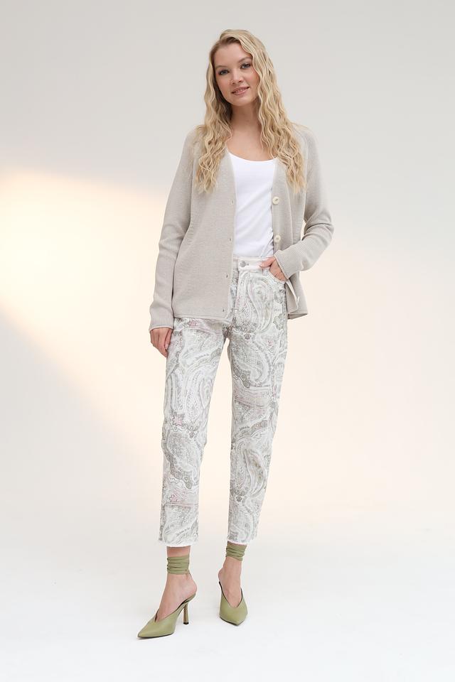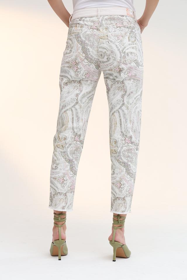Женские джинсы Marc Cain светло-бежевого цвета с оригинальным узором пейсли. Модель выполнена из органического хлопка с добавлением эластана для комфортной посадки и свободы движений. Состав: хлопок органич. 97%, эластан 3%