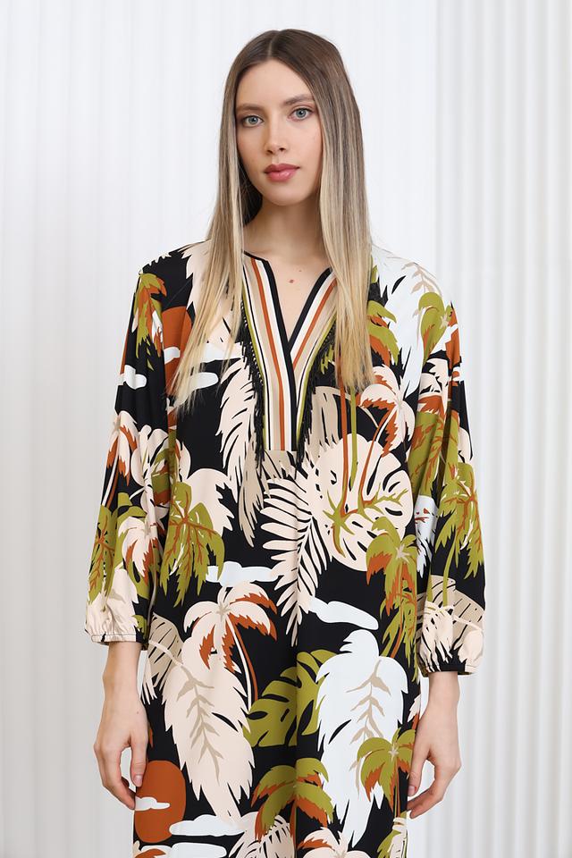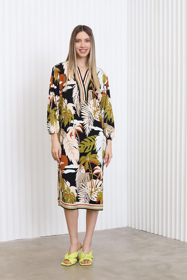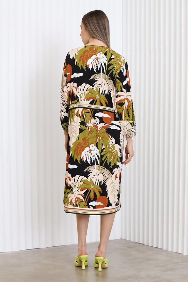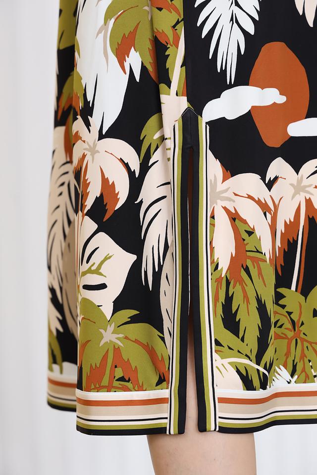 Основным акцентом платья является яркий и красочный тропический принт, выполненный в сочетании чёрного, бежевого, зелёного и коричневого цветов. По низу платья проходит декоративная полоска в тонкую полоску. Боковой разрез добавляет динамики и лёгкости.