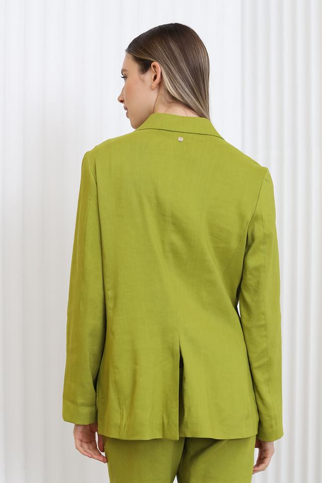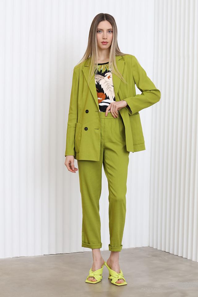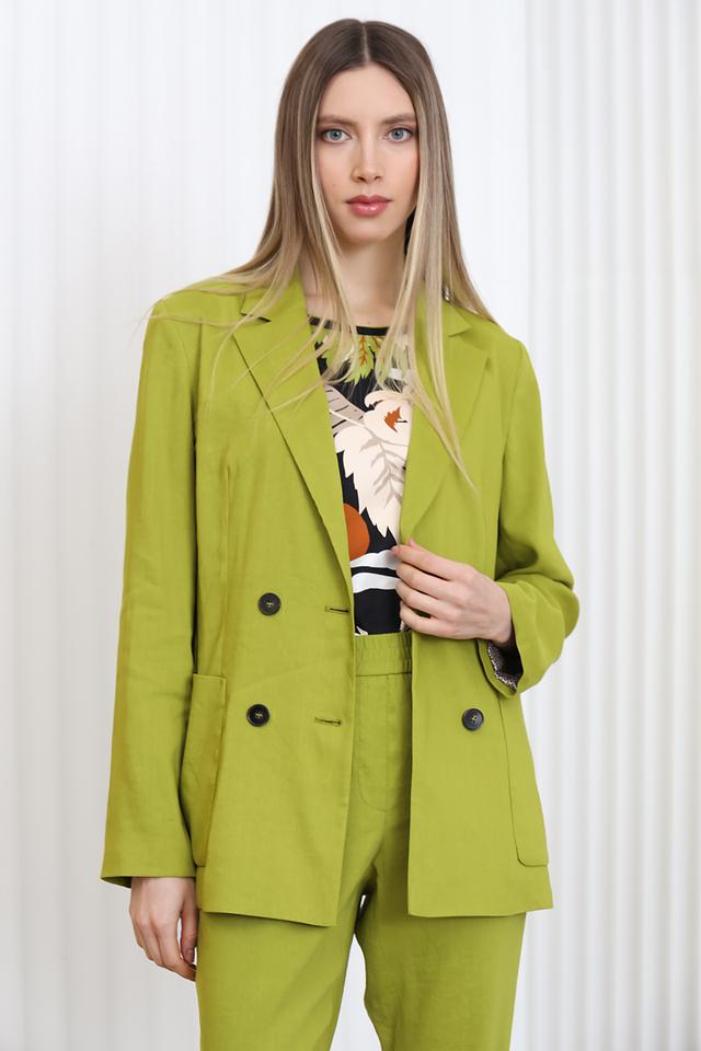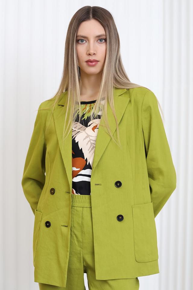 Жакет Marc Cain цвета зелёного лайма – стильная модель прямого кроя с двубортной застёжкой. Жакет выполнен из льняной ткани с добавлением вискозы и эластана, что обеспечивает комфорт и лёгкость в носке. Идеально дополнит повседневный и деловой гардероб. Состав: лен 59%, вискоза 39%, эластан 2%