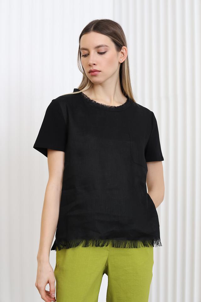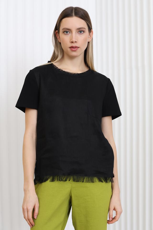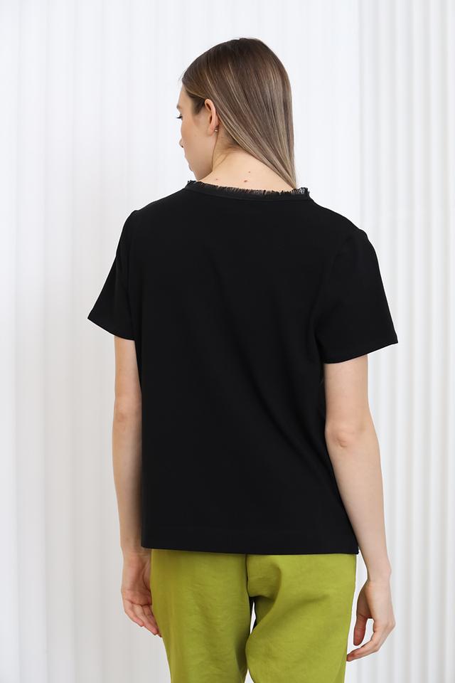 Чёрная блуза от Marc Cain из хлопка с эластаном. Модель свободного кроя с короткими рукавами и необработанным низом, декорированным бахромой, придаёт образу лёгкость и непринуждённость. Состав: хлопок 95%, эластан 5%