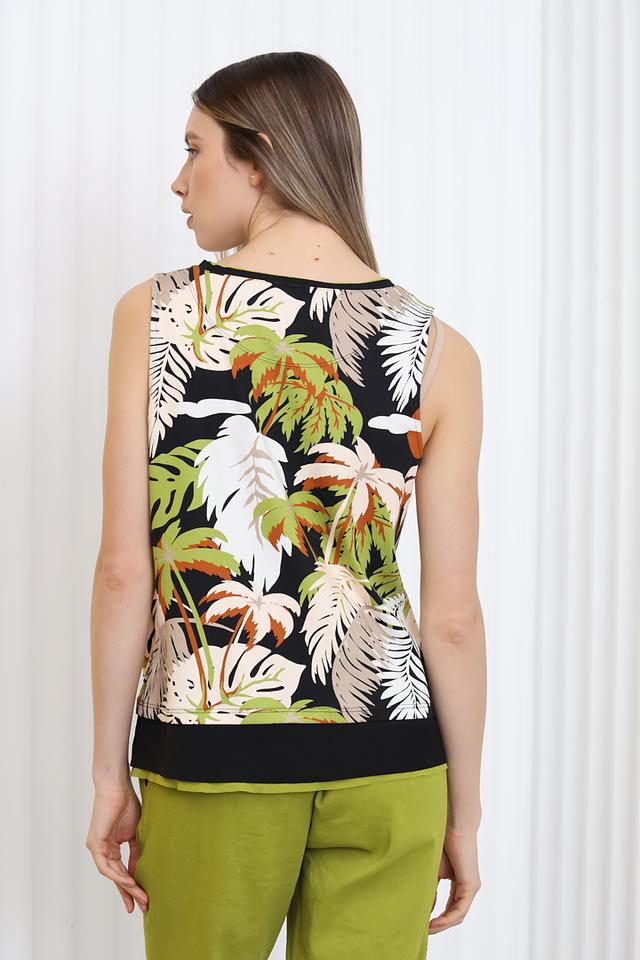 Топ Marc Cain с ярким тропическим принтом на черном фоне. Модель без рукавов с округлым вырезом горловины, выполнена из хлопка с добавлением эластана для комфорта и хорошей посадки. Состав: хлопок 94%, эластан 6%