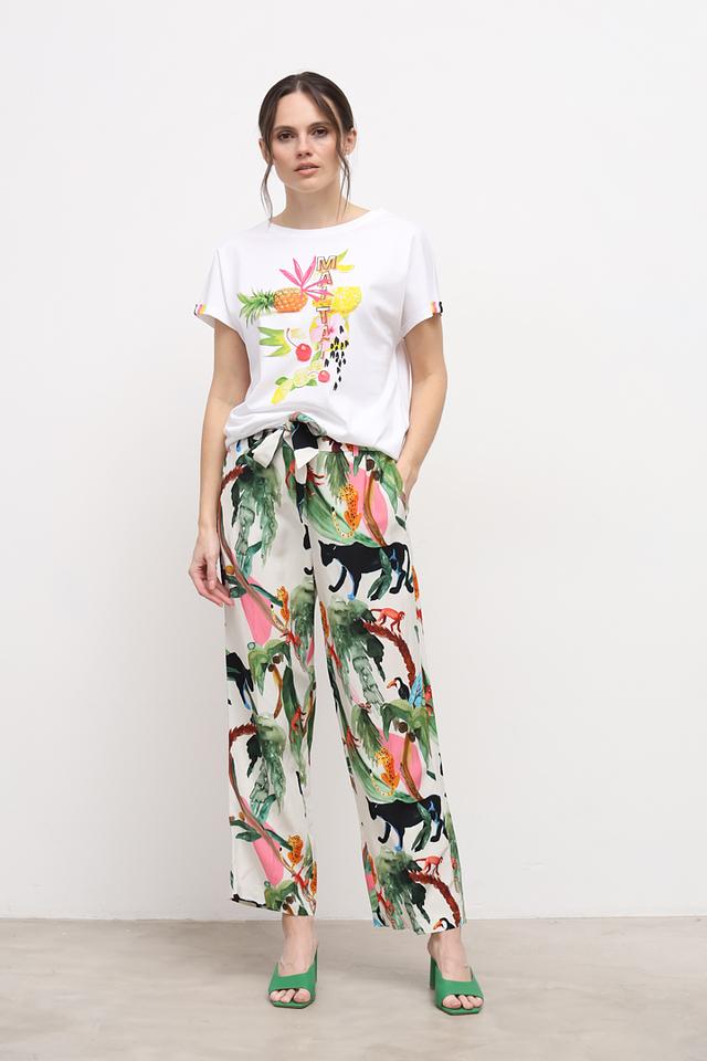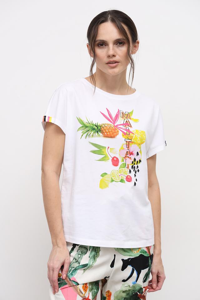 Особенностью данной модели является эффектный принт с изображением тропических фруктов и надписью "MATALUNA". Яркие цвета и оригинальный дизайн делают эту футболку идеальной для создания непринужденных летних образов.