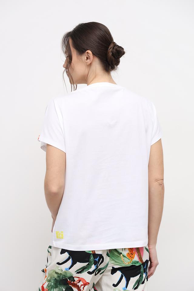 Круглый вырез горловины и короткие рукава обеспечивают свободу движений. Футболка имеет прямой, слегка свободный крой, который подходит для разных типов фигур. На рукаве присутствует декоративная полоска в тон принта.