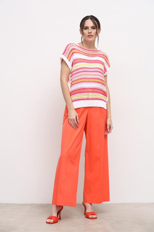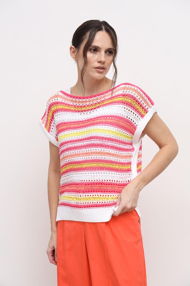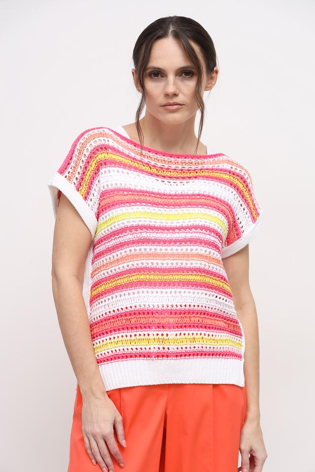 Топ Marc Cain ярких цветов с полосатым узором. Модель с короткими рукавами и округлым вырезом горловины выполнена из хлопкового трикотажа, что обеспечивает комфорт и удобство в носке. Состав: хлопок 72%, полиамид 28%
