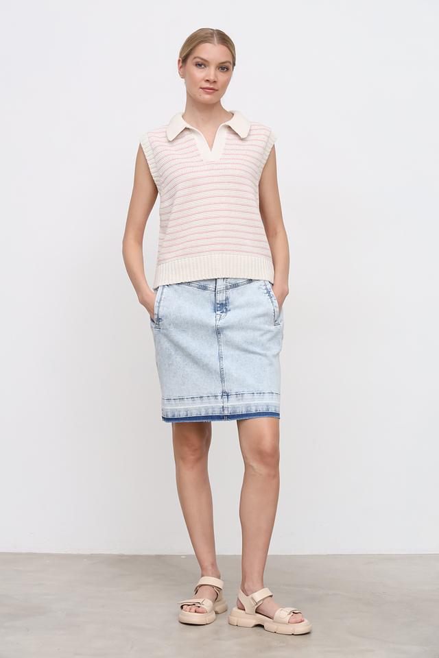 Юбка имеет классический прямой крой и длину до колена. Голубой цвет и эффект "вареной" джинсы придают ей современный и непринужденный вид. Модель оснащена боковыми карманами и стандартной застежкой на молнию и пуговицу.