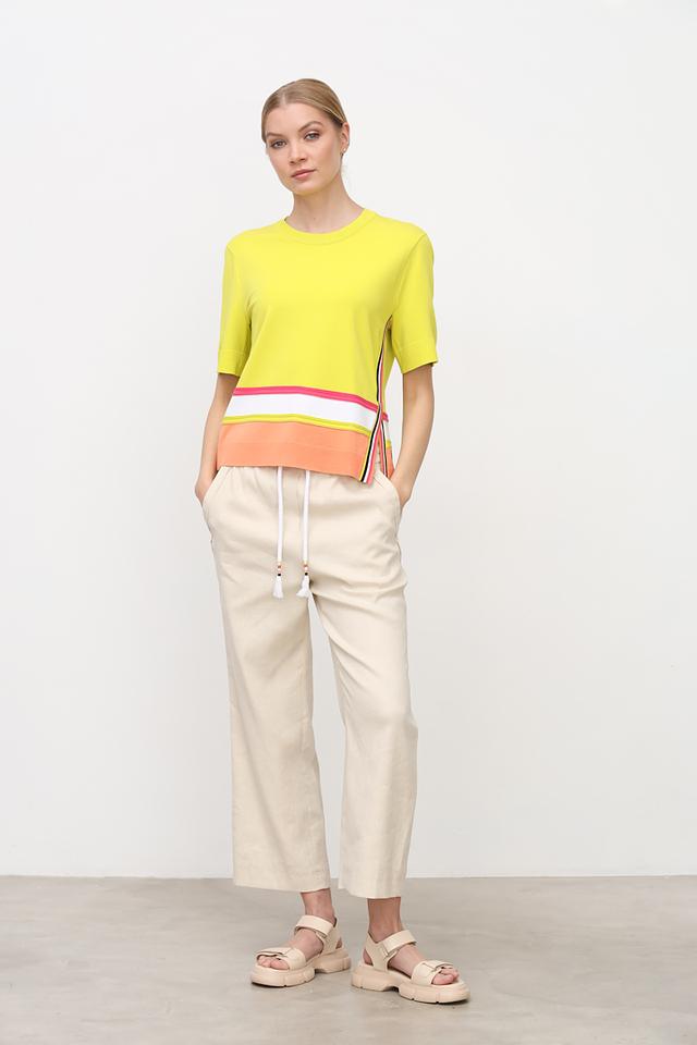 Благодаря своему лаконичному дизайну и нейтральному бежевому цвету, эти брюки легко сочетаются с различными элементами одежды, позволяя создавать разнообразные образы – от повседневных до более элегантных. Состав: 65% лен, 34% хлопок, 1% эластан.