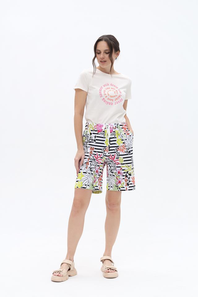 Женские шорты Marc Cain в белой расцветке с ярким цветочным принтом и удобным шнурком на поясе. Модель выполнена из высококачественного полиамида с добавлением эластана, обеспечивающего комфорт и свободу движений. Состав: полиамид 86%, эластан 14%