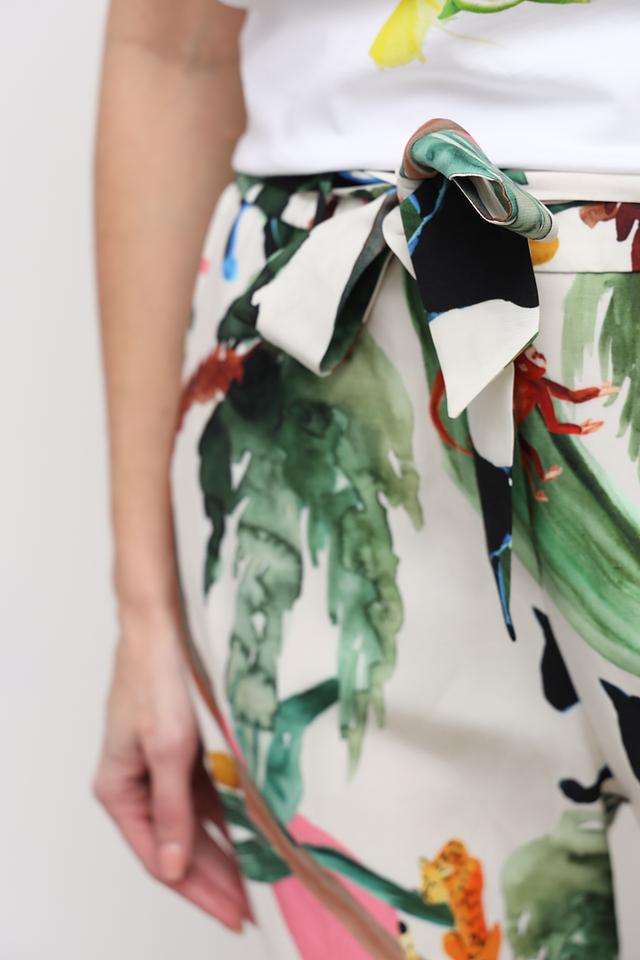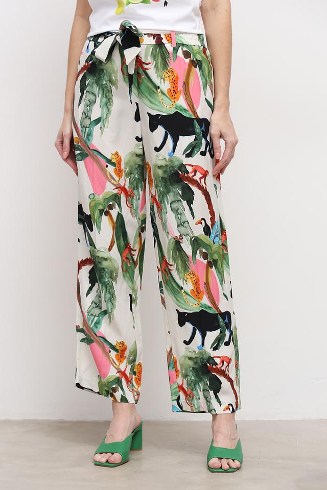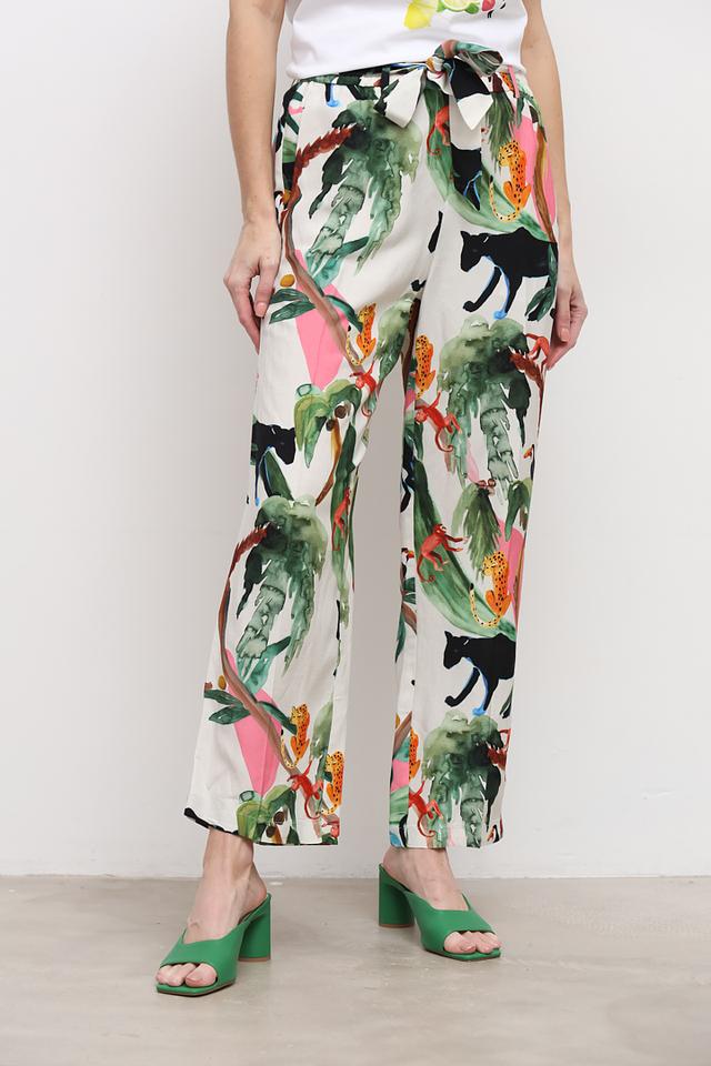 Особенностью модели является эффектный тропический принт, включающий в себя изображения пальм, экзотических цветов и силуэты животных. Брюки дополнены завязками на талии, которые позволяют регулировать посадку и подчеркнуть фигуру.