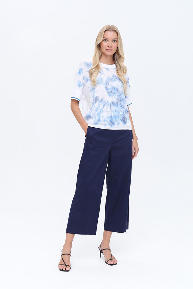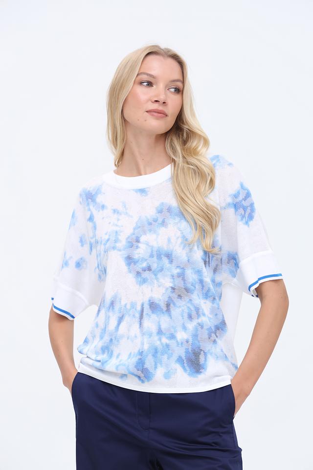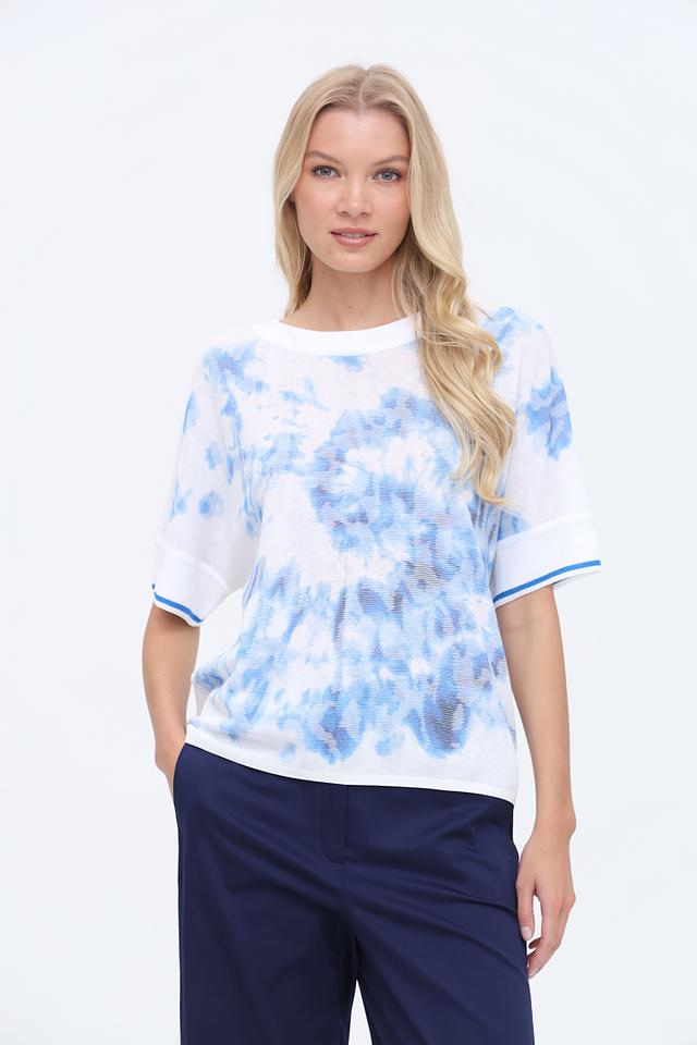 Женский пуловер Marc Cain голубого цвета с оригинальным принтом в стиле тай-дай. Модель выполнена из мягкого трикотажа с короткими рукавами и отделкой манжет в тон. Идеальный выбор для создания стильного и комфортного образа. Состав: полиэстер 47%, хлопок 32%, вискоза 21%